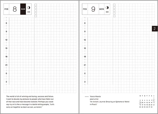 | Daily Pages | Jan. 1 - Dec. 31, 2026 (377 pages) *A page is included at the beginning of each month to help in planning ahead. *All daily pages include daily quotes. *Includes a mini monthly calendar at the bottom right of every two-page spread (Monday- / Sunday-start). *Additionally, a blank two-page spread is featured at the beginning to provide a free area when starting out the book. |