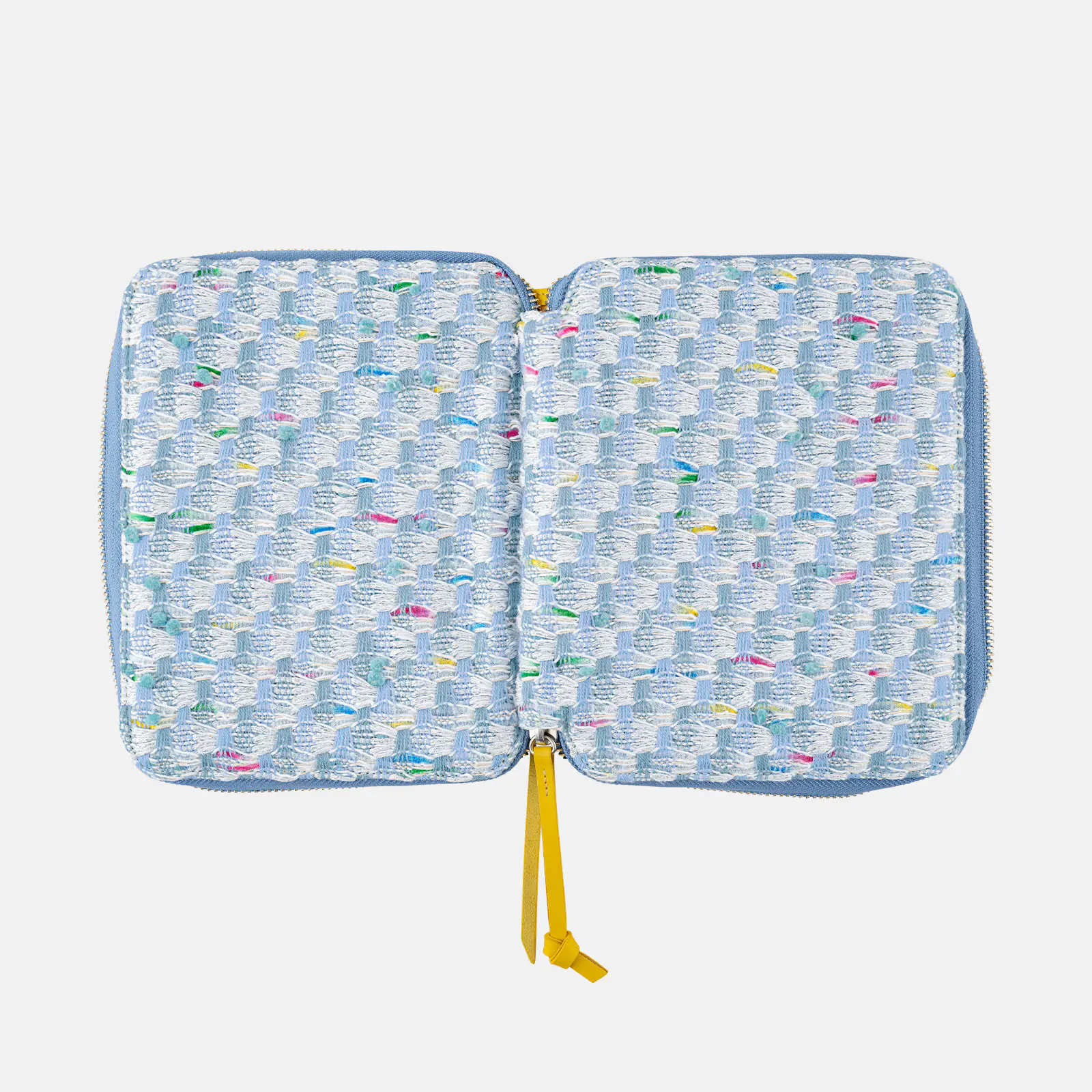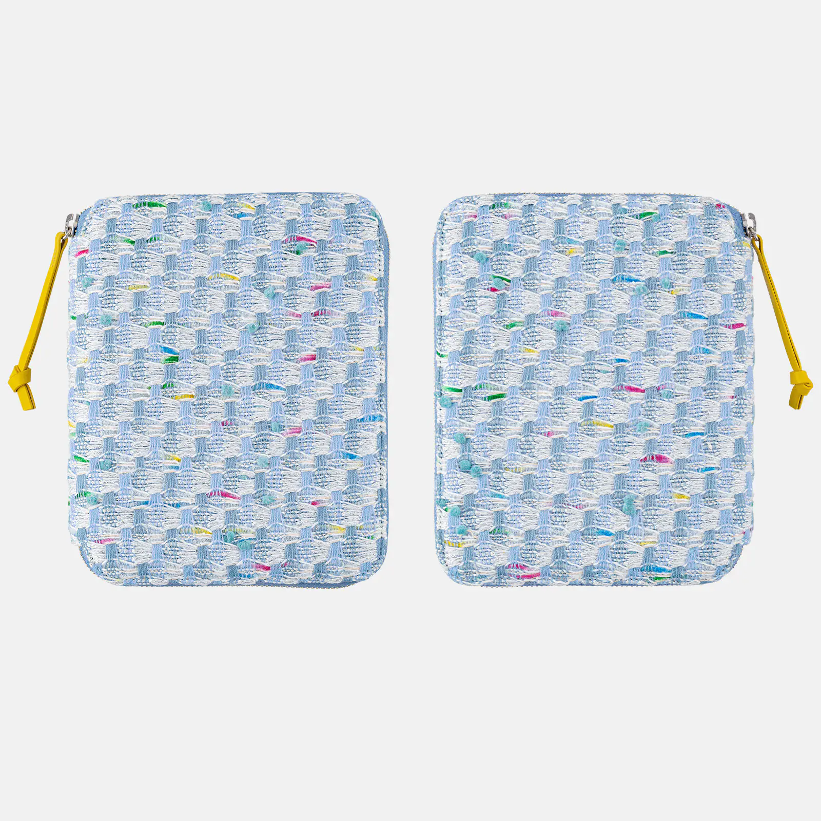 Each blue, white, and silver thread is woven horizontally, spreading downward, looking like sparkling waves in the summer sea. The threads of translucent red, green, blue, and yellow occasionally appear in between. The randomly placed pom-poms add a charm to the fabric.