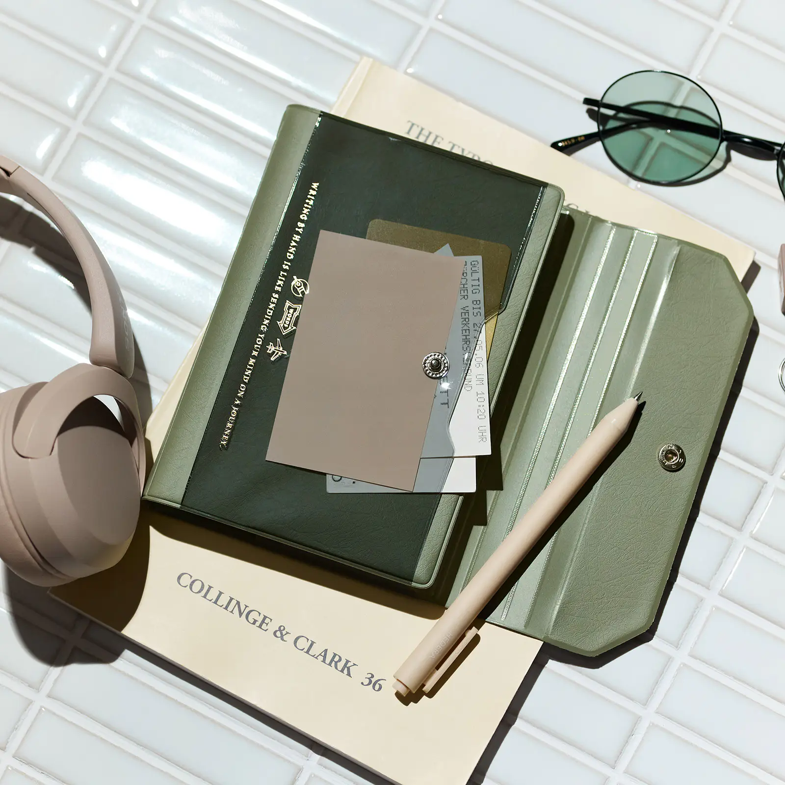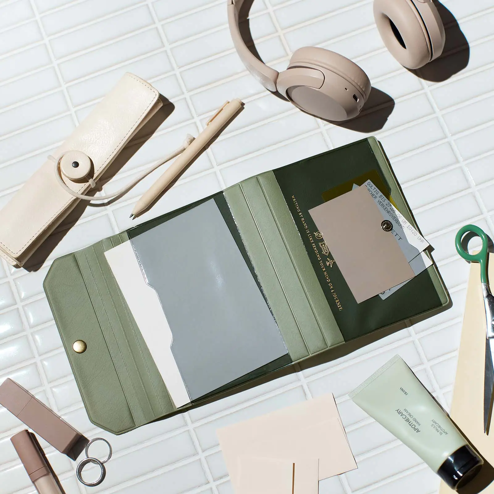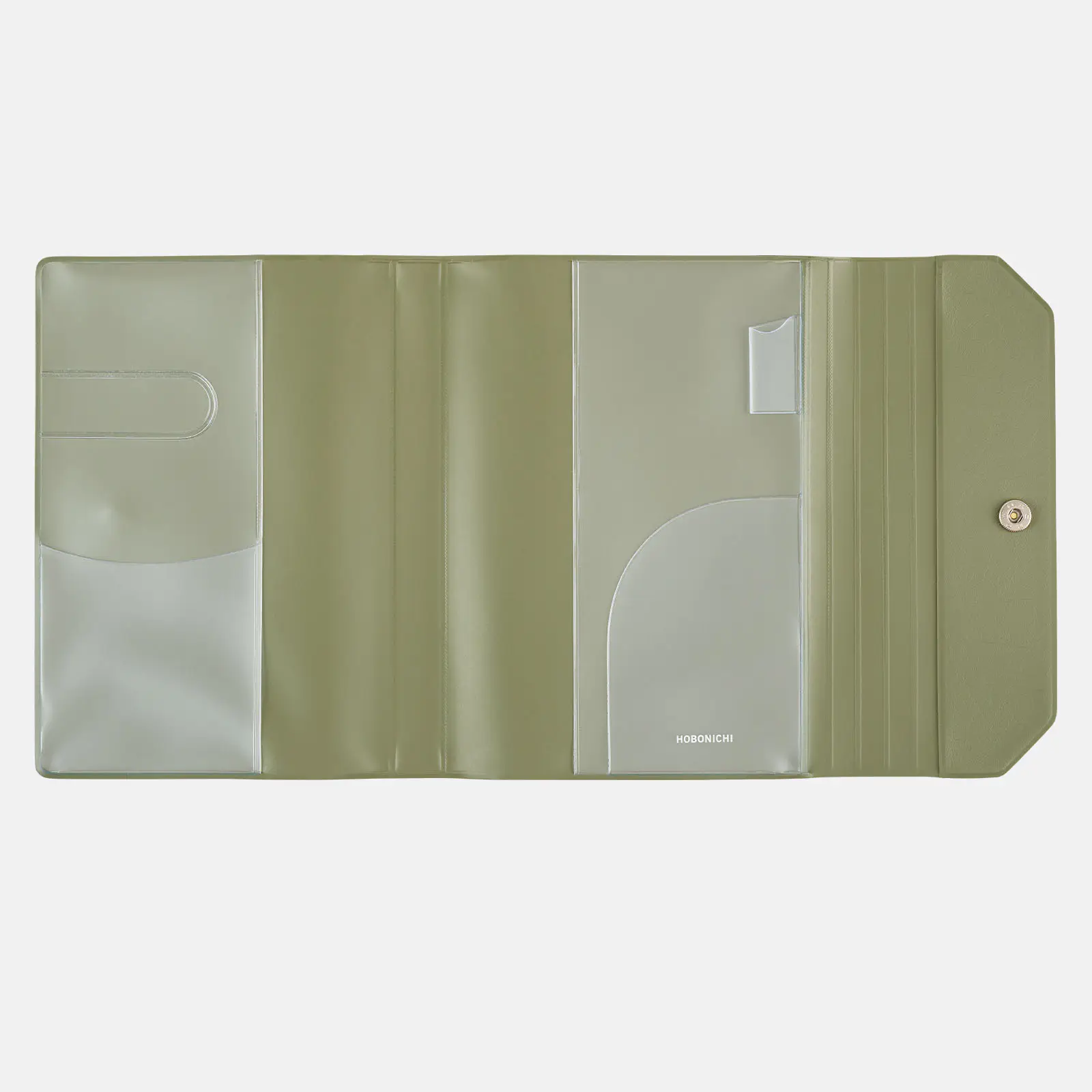 The inner right pocket can fit postcards or tickets, and the pen hook can hold a pen by its clip.