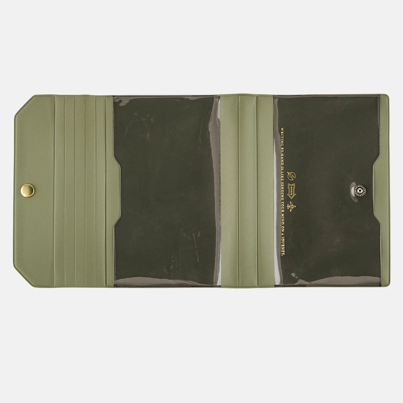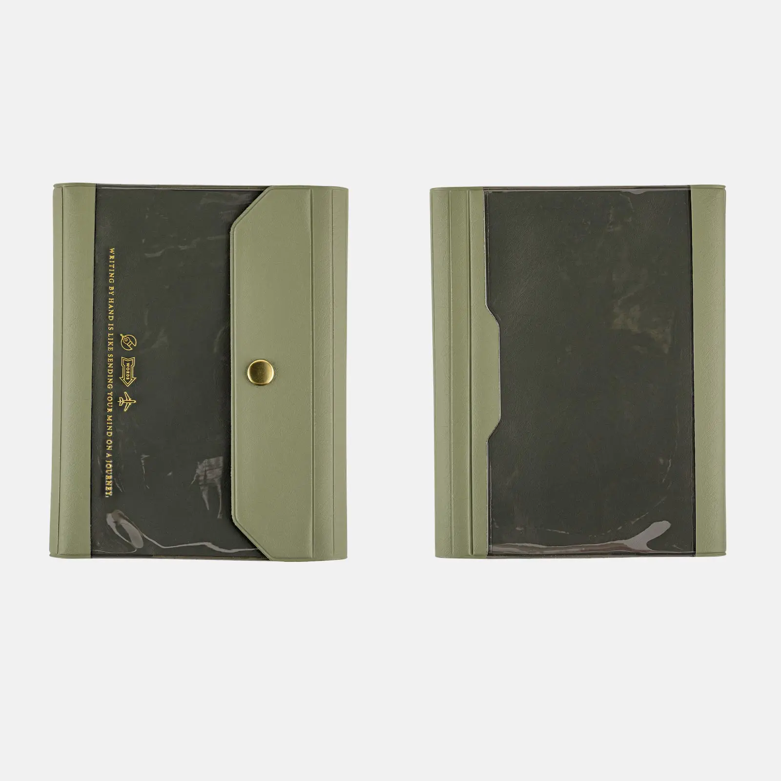 This slim PVC cover has a clear pocket as its main feature. The cover name “Alettone” refers to the part of an aircraft’s wings called an aileron, due to the way the techo cover’s lid can similarly fold shut with a snap. The soft PVC material makes it light and comfortable to carry, while the subdued color scheme gives it a sense of elegance. It closes with a snap button and has a design that fits any user in any setting. Foil-pressed in gold is the thought-provoking message, “Writing by hand is like sending your mind on a journey.”