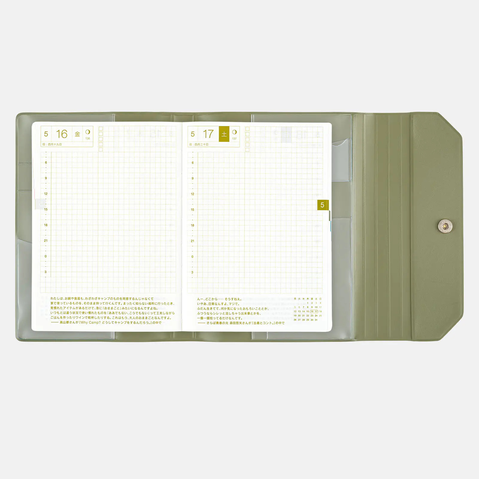 This compact A6 size techo has spacious daily pages and a simple graph-paper design that offers plenty of freedom to draw, paste, and write.
