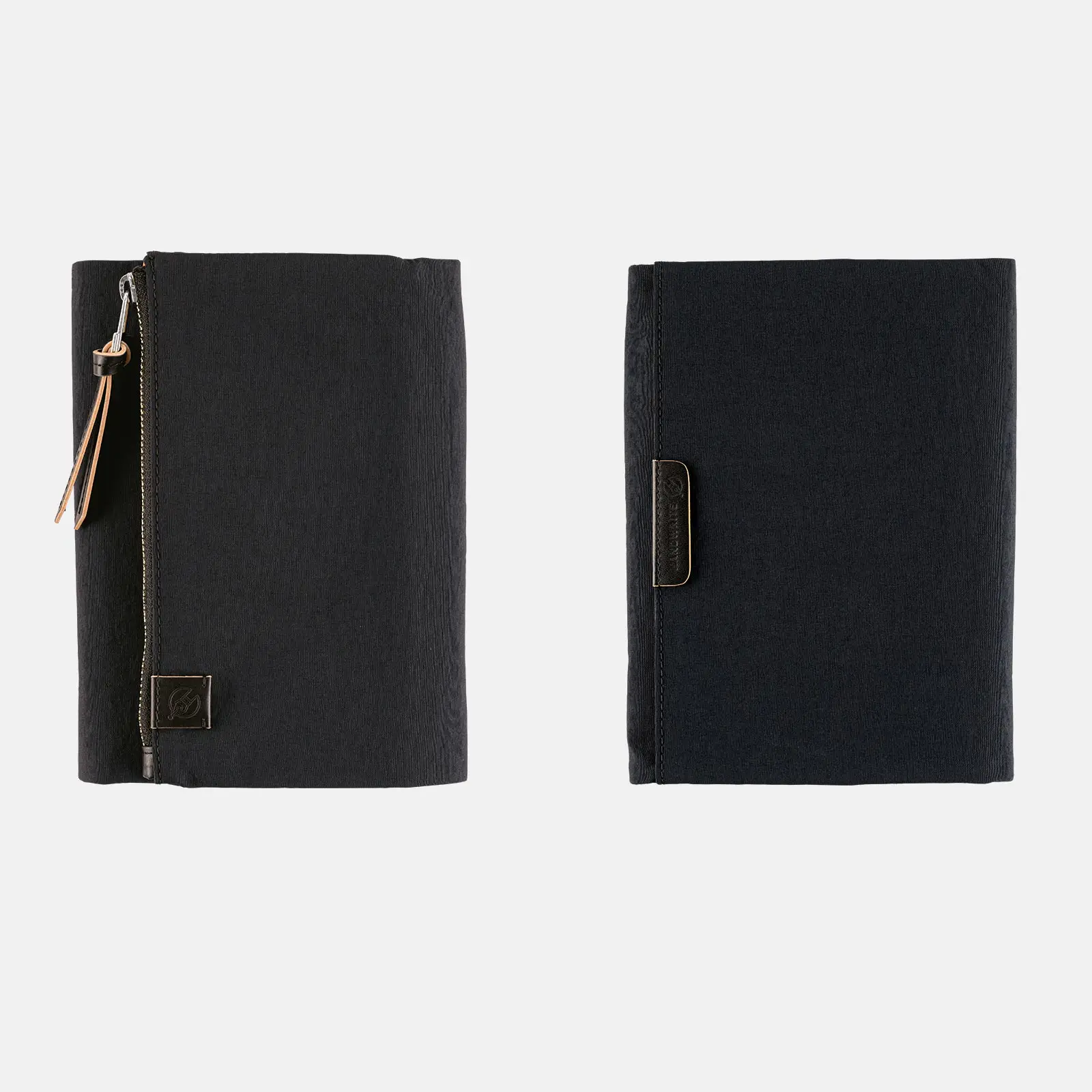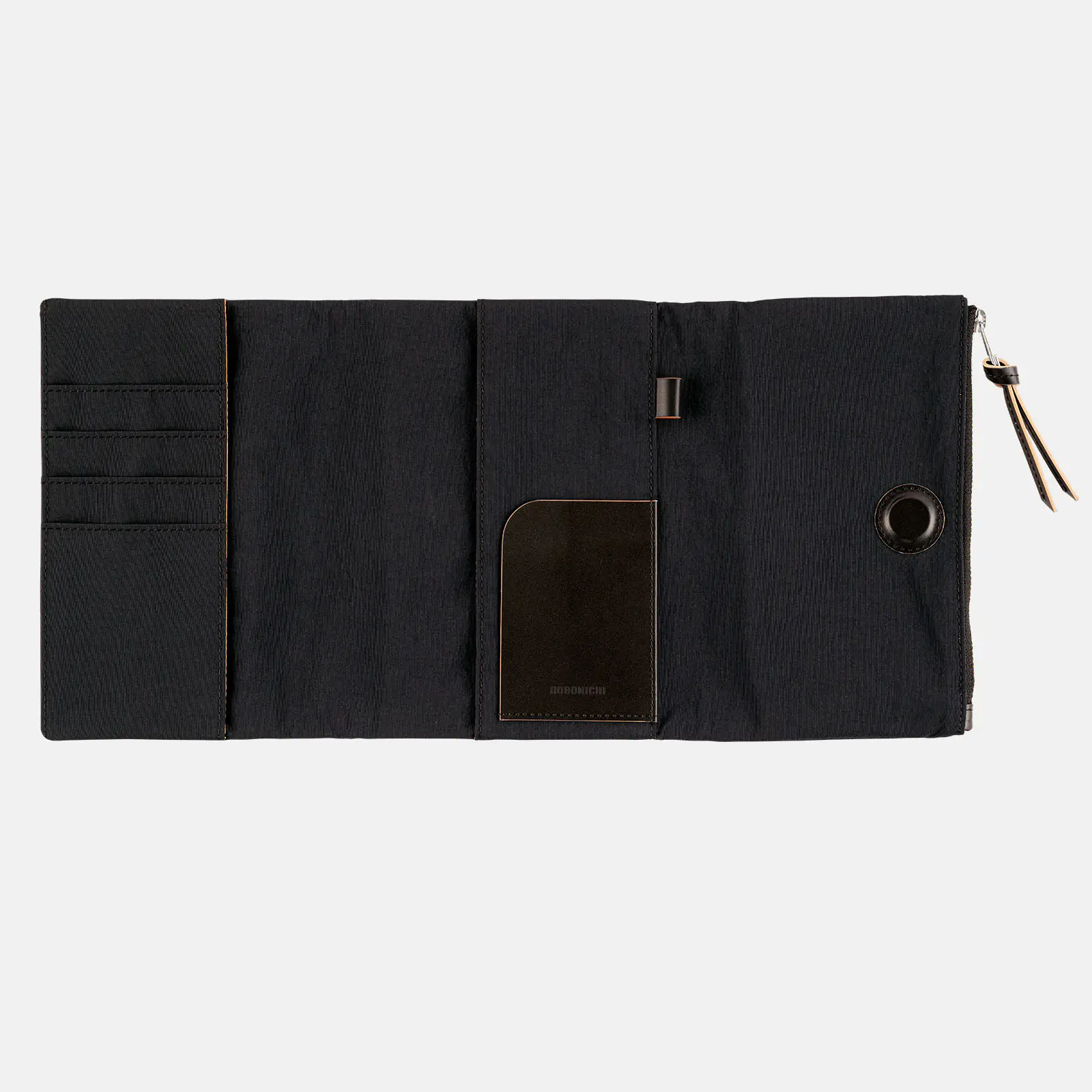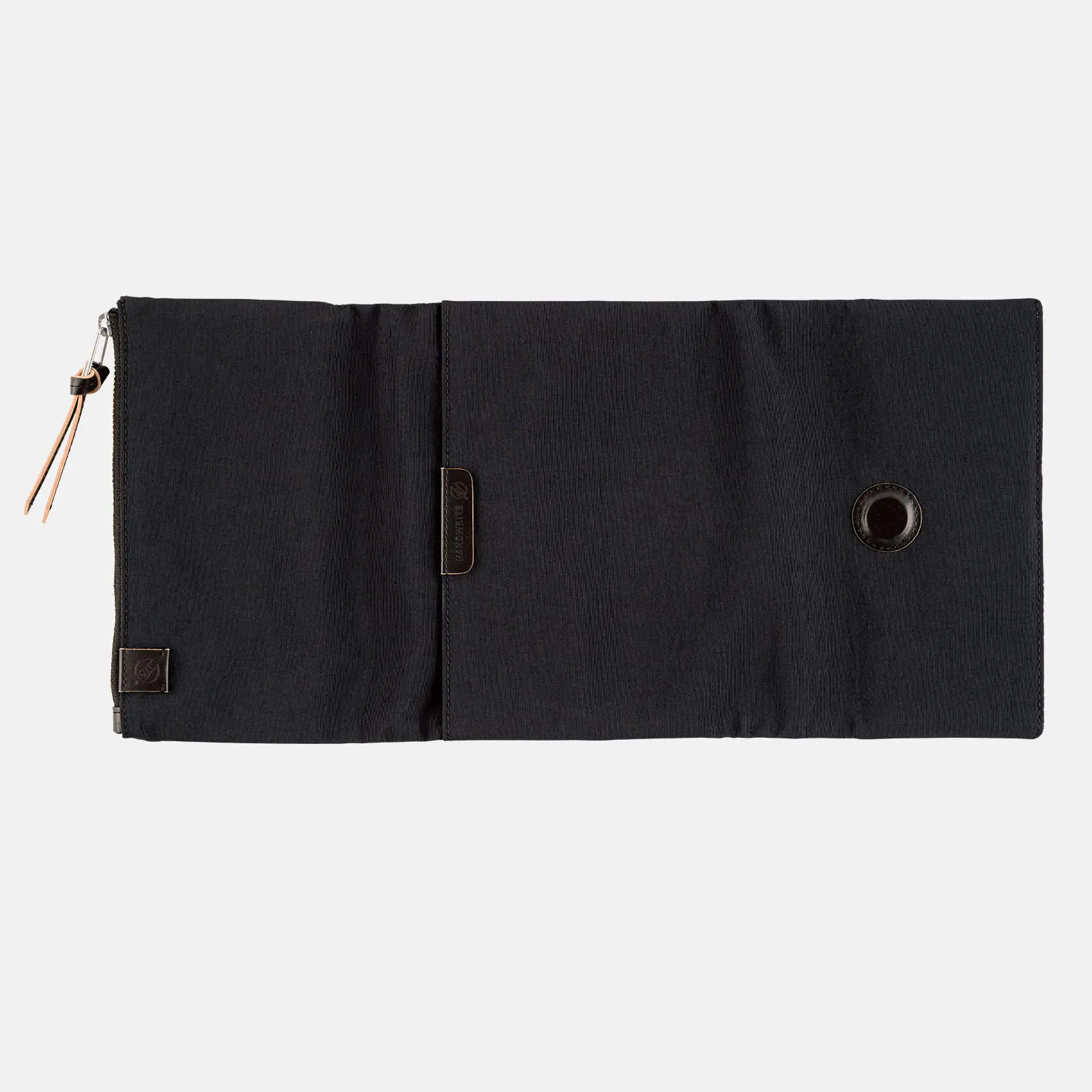 The cover closes with a hidden magnet, which is padded with a leather patch for a softer touch. The outer pocket also features a leather zipper pull.