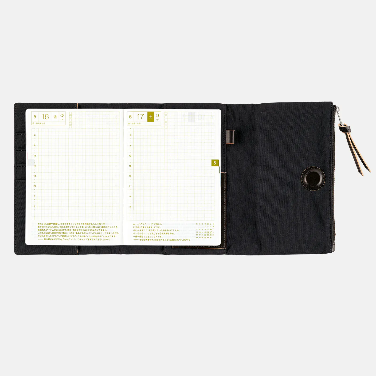 This compact A6 size techo has spacious daily pages and a simple graph-paper design that offers plenty of freedom to draw, paste, and write.