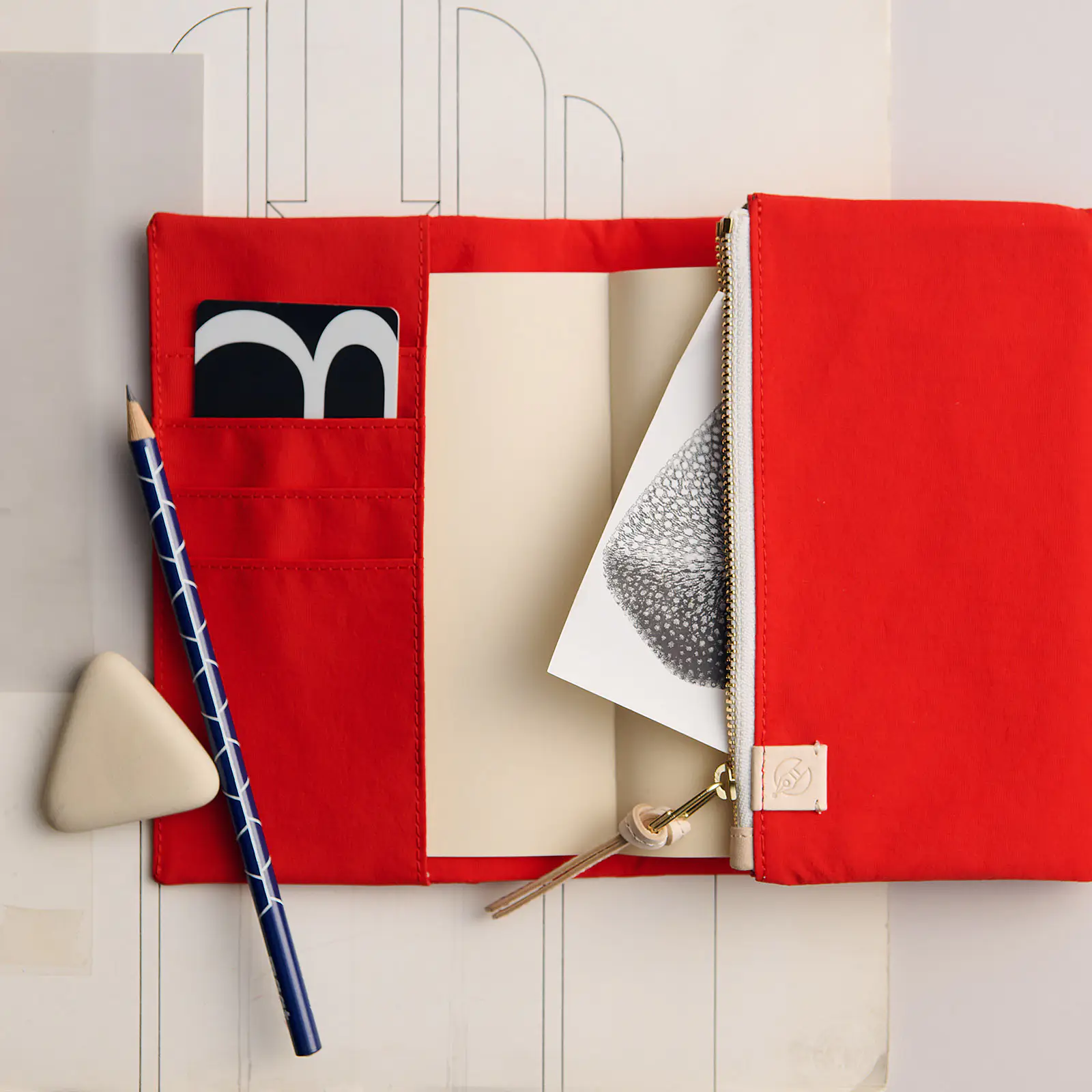 The cover closes with a hidden magnet, which is padded with a leather patch for a softer touch. The outer pocket also features a leather zipper pull.