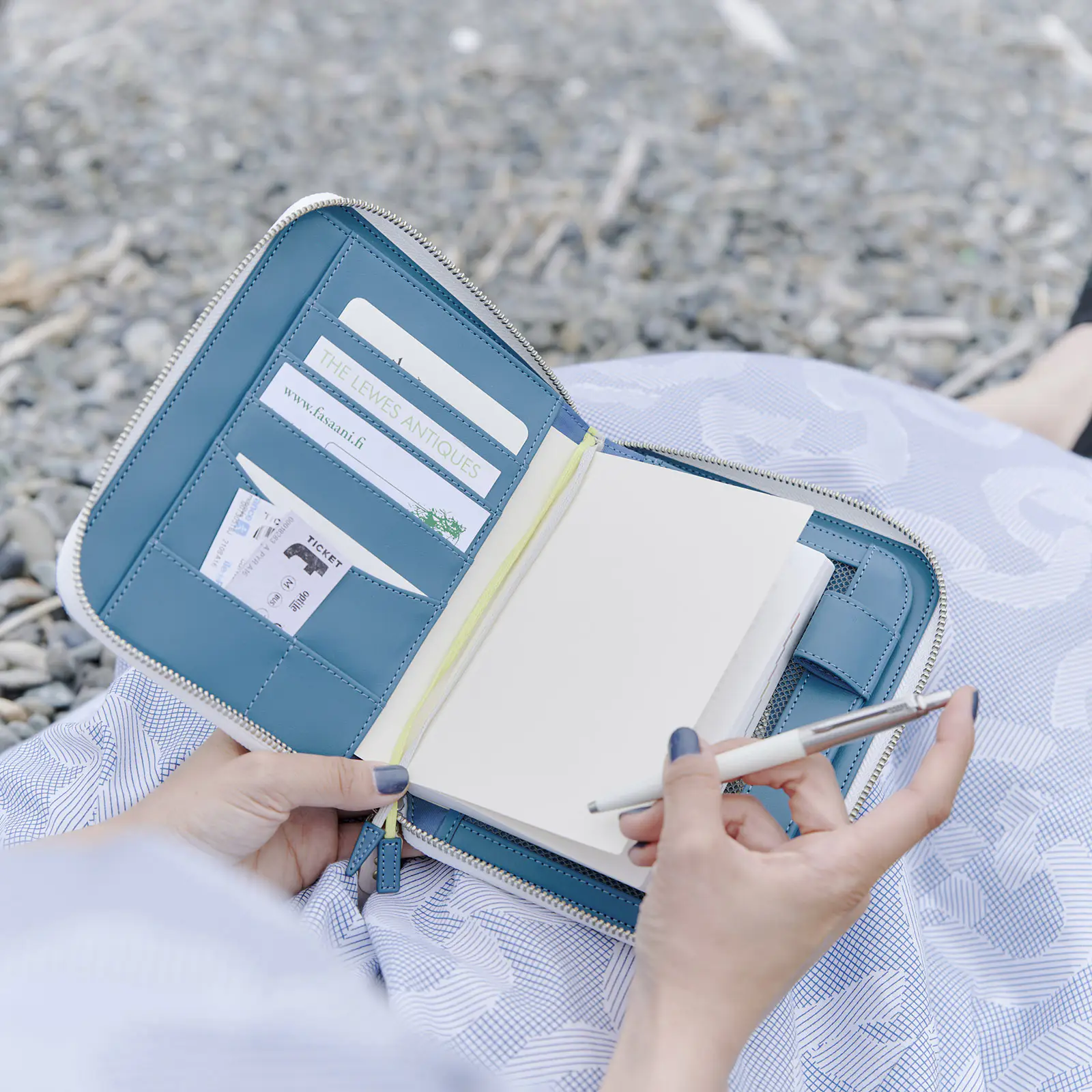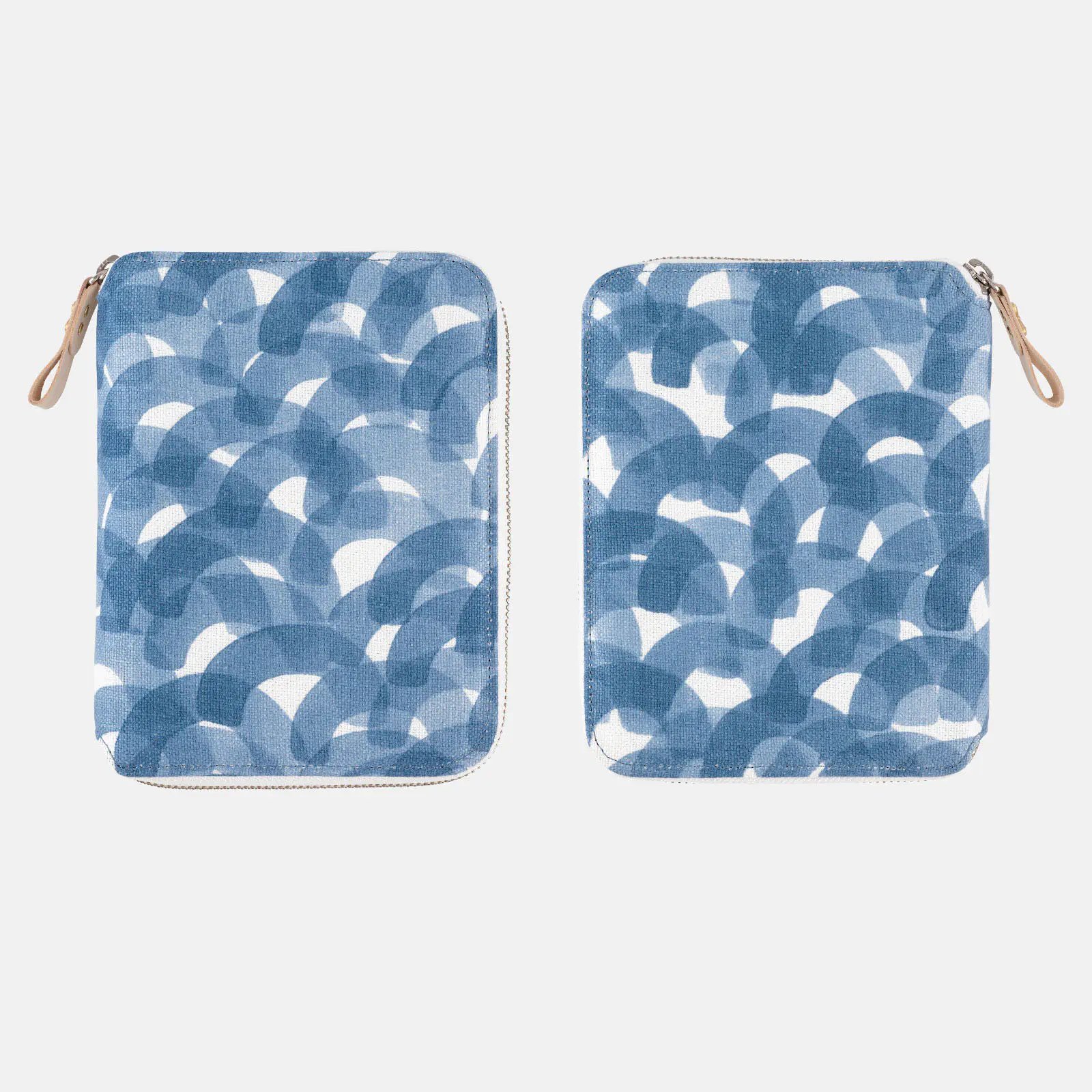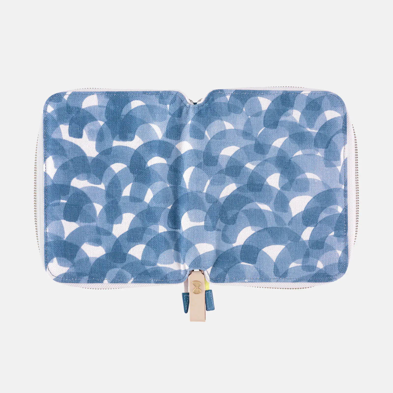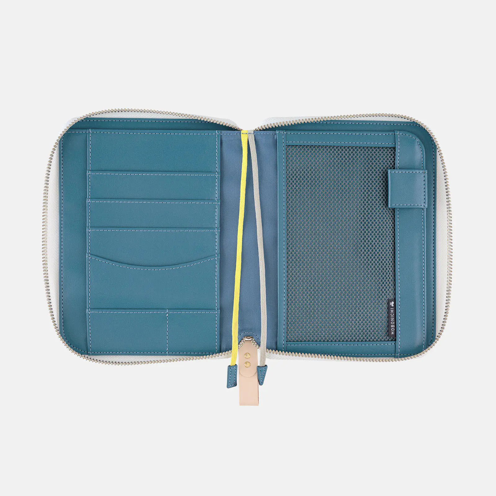 The fabric is a linen with a smooth texture. The interior comes in a deep blue shade, while the two bookmarks are yellow and gray, respectively.
