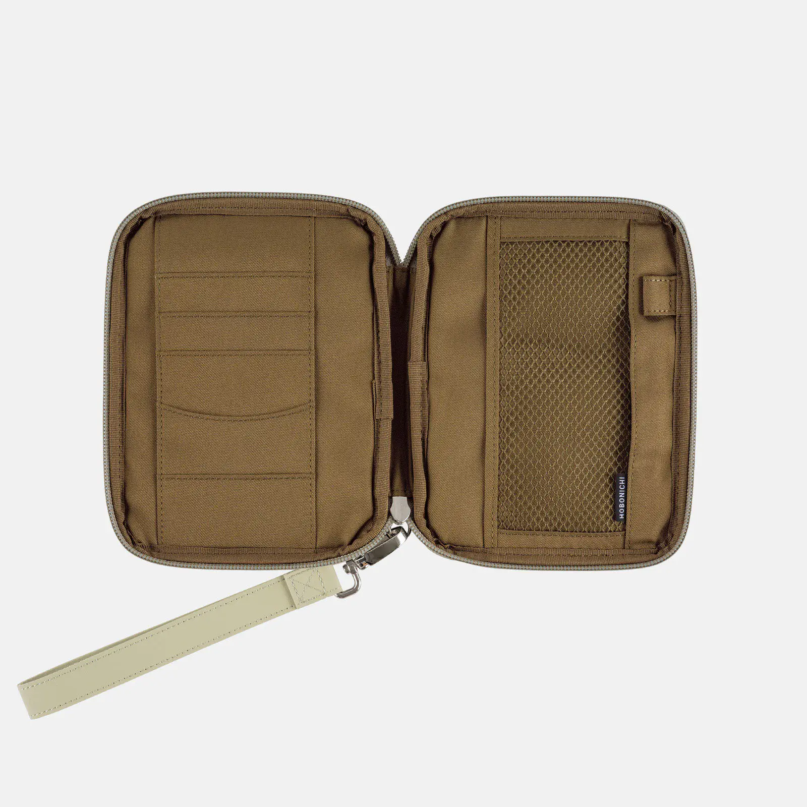 The interior is a deep olive green. It features a mesh pocket, and the pen hook holds a pen by its clip. Even when closed, the cover maintains a neat, sleek look.