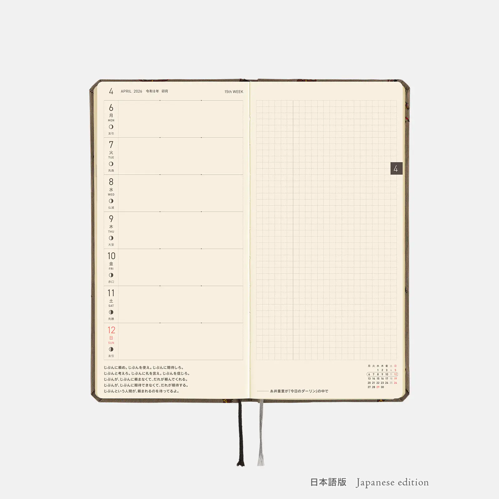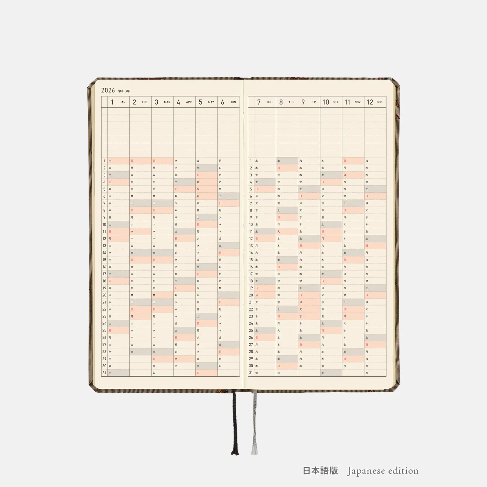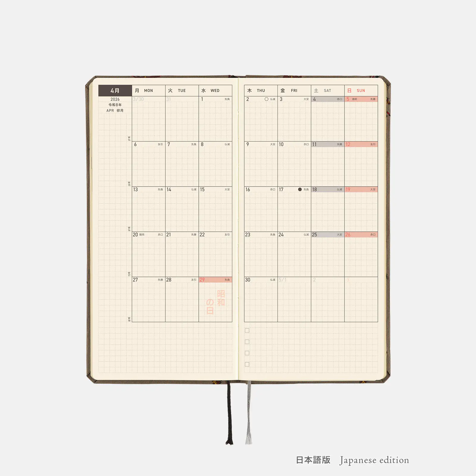 | Bonus Pages | 365 Days Check-Off Sheet / Using Things around You to Measure Size / My 100 / Memories 2026 / 12 Switches to Help You Focus / Solar Terms / Emergency Preparedness / Age Table / Conversion Chart / Getting the most of Hobonichi / Contact List / Personal Notes |