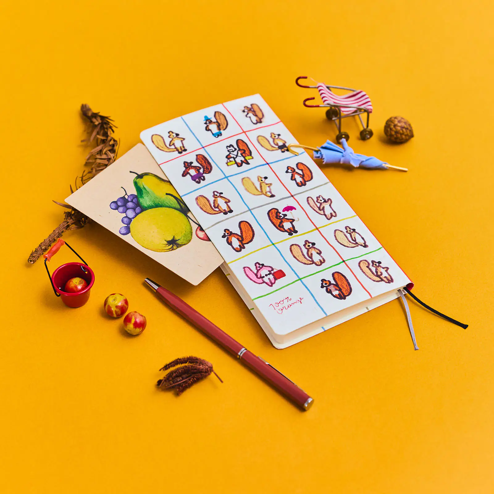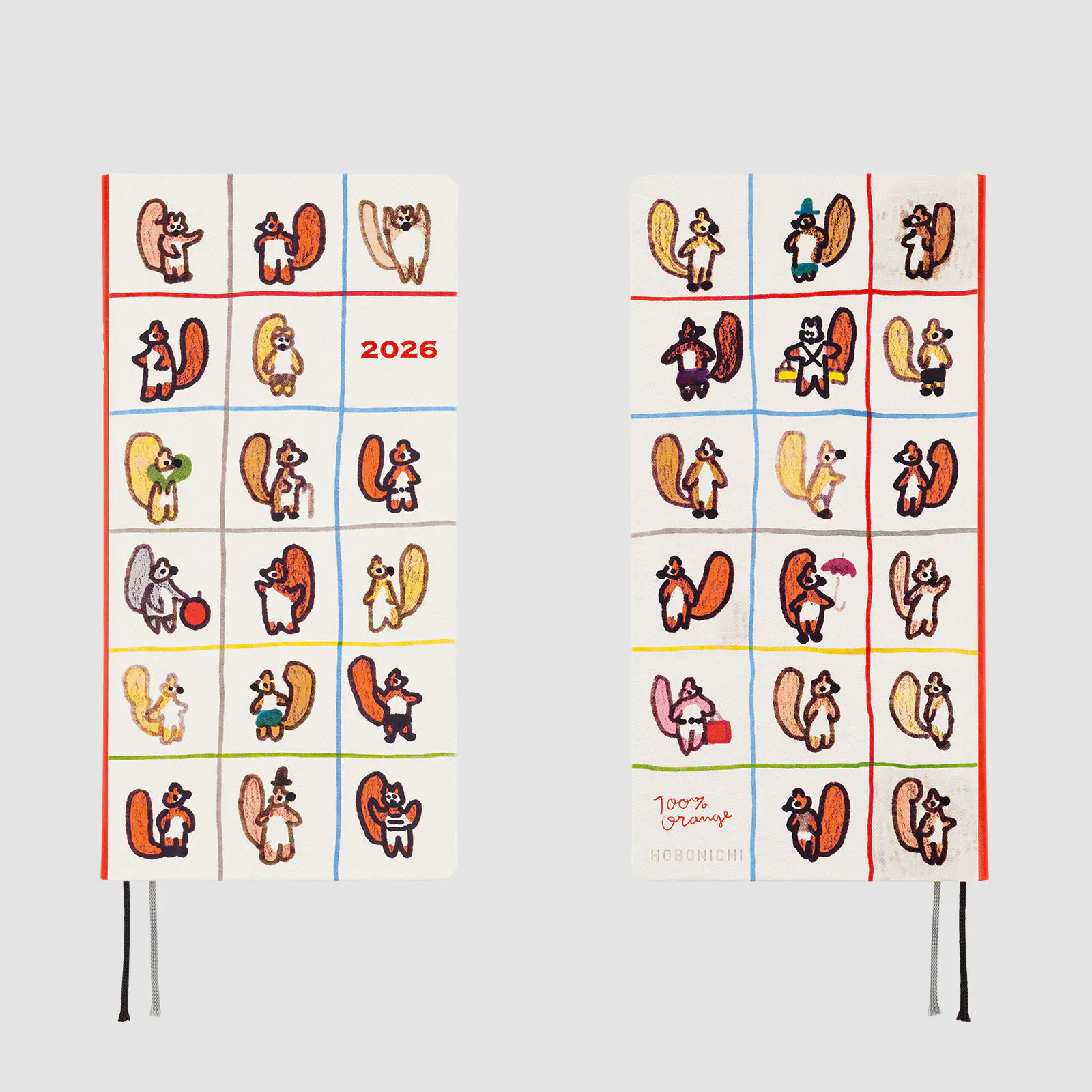 The front cover showcases an arrangement of the original picture book cover. Various unique squirrels—one wearing a hat, another holding an apple and yet another holding an umbrella, among others—are placed in a grid made with markers in colors like red and light blue. While undoubtedly charming and adorable, this design’s graphical style also gives it a cool edge. The hardcover is made out of a sturdy yet flexible material and features a finely textured surface.