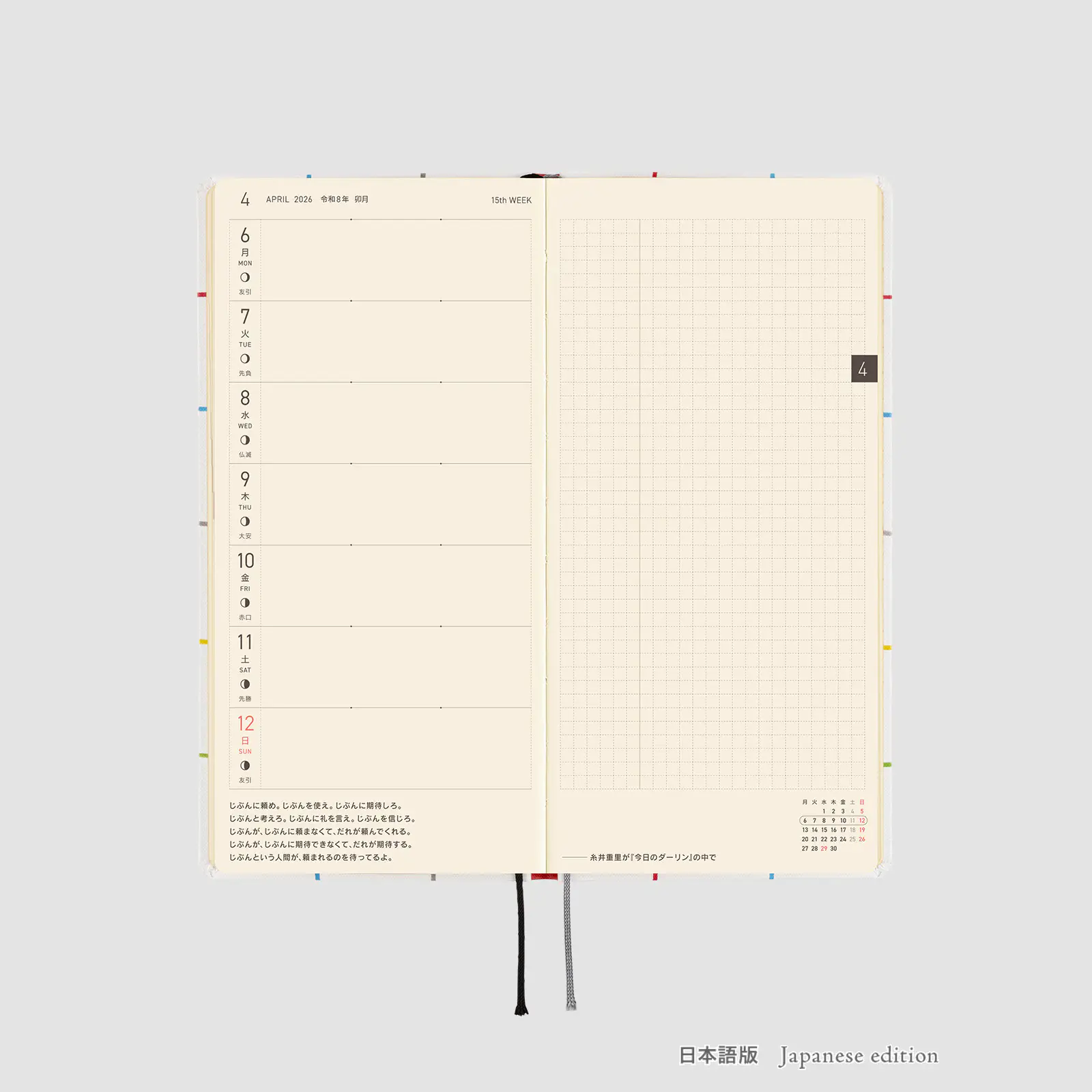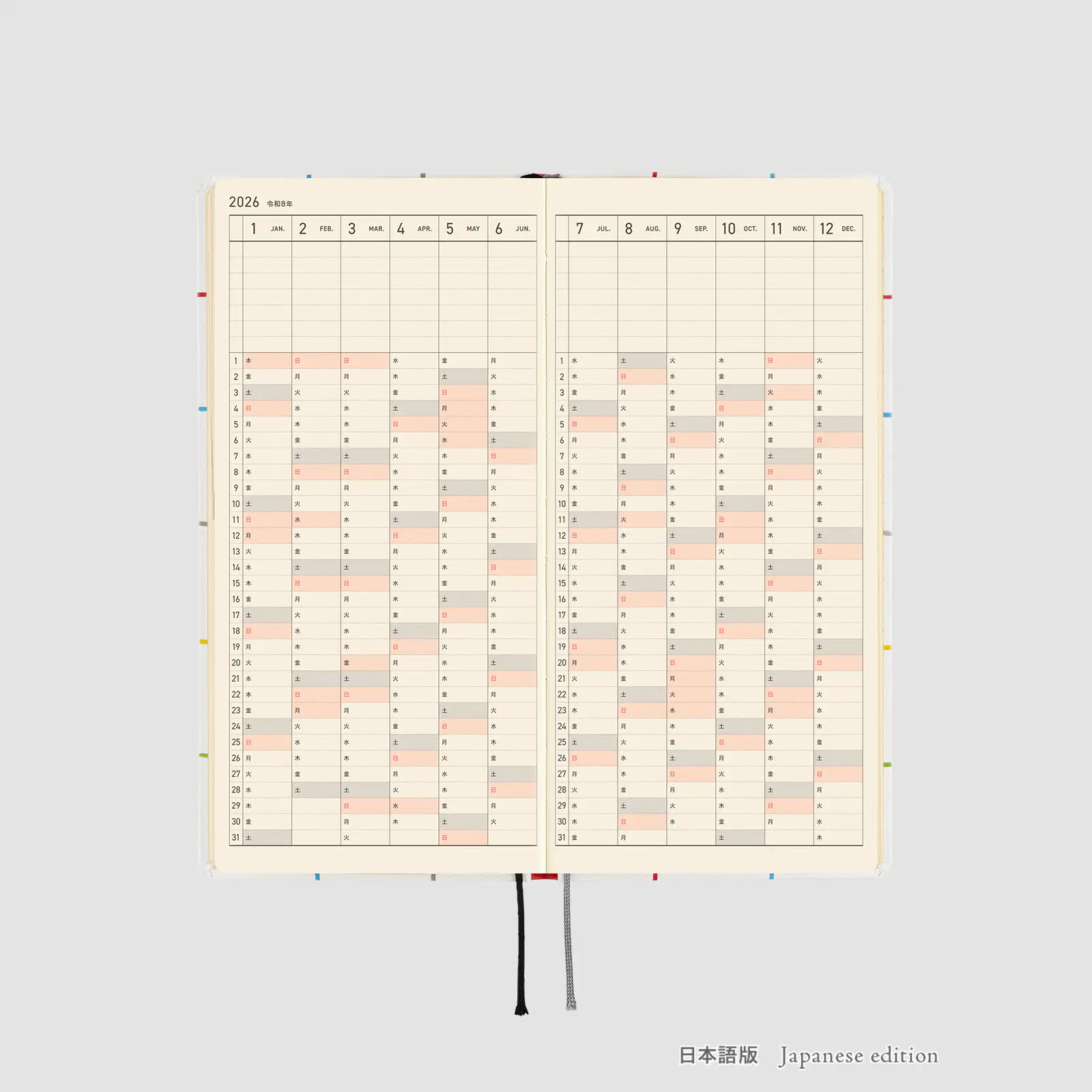 | Bonus Pages | 365 Days Check-Off Sheet / Using Things around You to Measure Size / My 100 / Memories 2026 / 12 Switches to Help You Focus / Solar Terms / Emergency Preparedness / Age Table / Conversion Chart / Getting the most of Hobonichi / Contact List / Personal Notes |