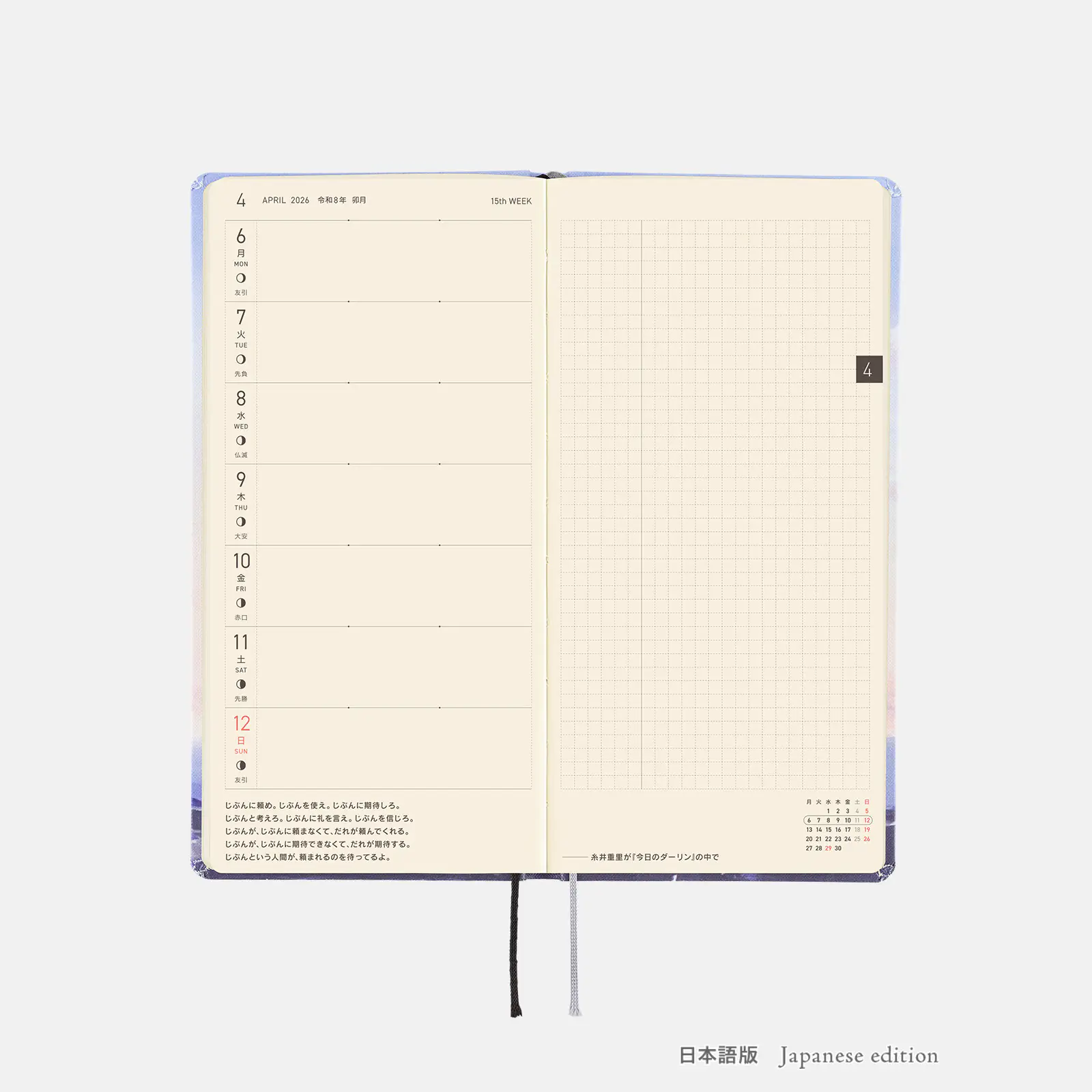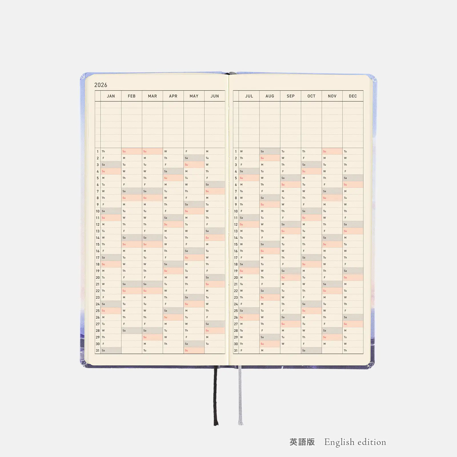 | Bonus Pages | 365 Days Check-Off Sheet / Using Things around You to Measure Size / My 100 / Memories 2026 / 12 Switches to Help You Focus / Solar Terms / Emergency Preparedness / Age Table / Conversion Chart / Getting the most of Hobonichi / Contact List / Personal Notes |