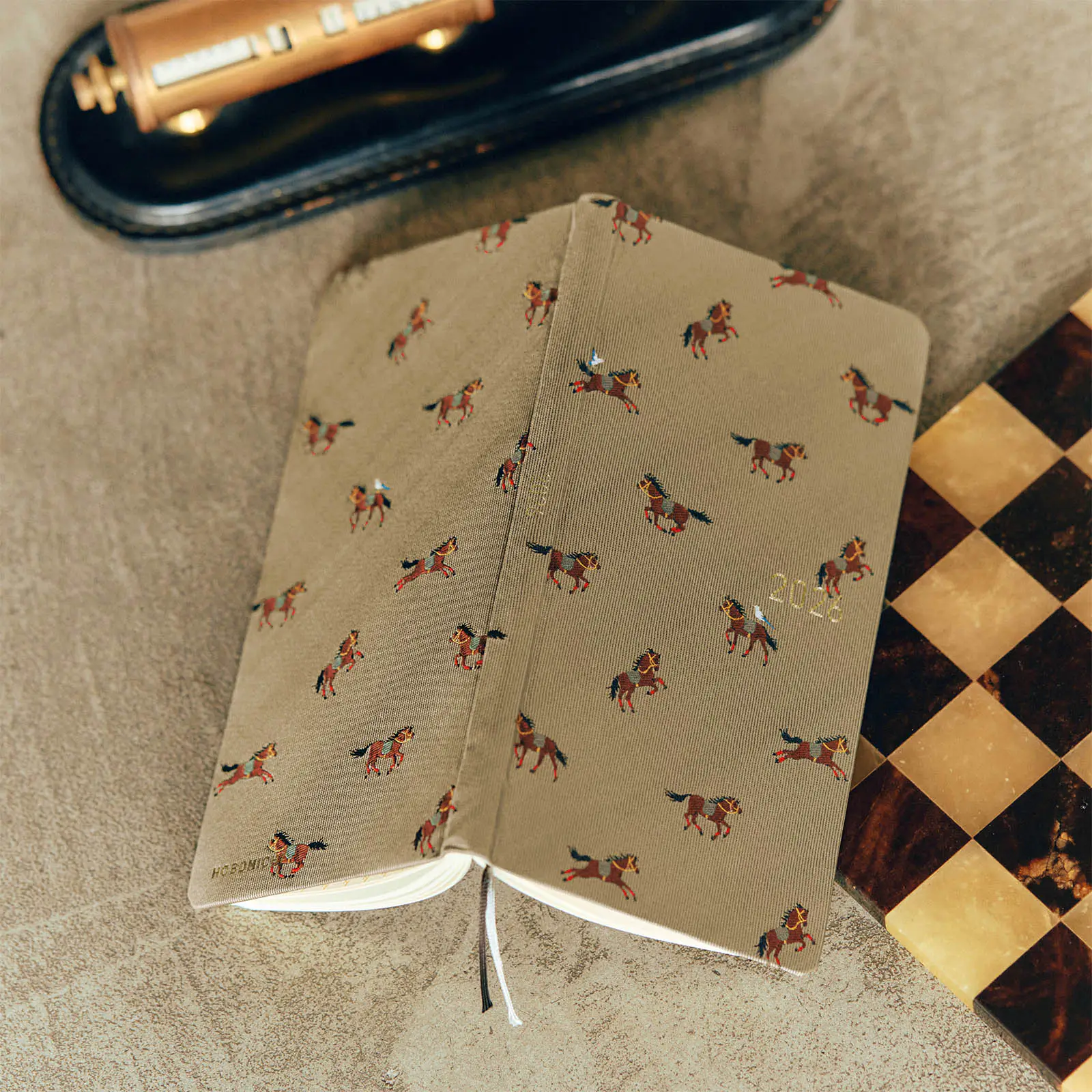 The Bow & Tie series is covered with the same textured, shiny fabric used in neckties. The material has a beautiful gloss and is soft to the touch. On this Galloping Horses cover, a variety of horses—some galloping, some walking—are woven into a chic beige background. The horses spending their time in leisure are depicted in fine detail through the intricate weave of necktie fabric.
