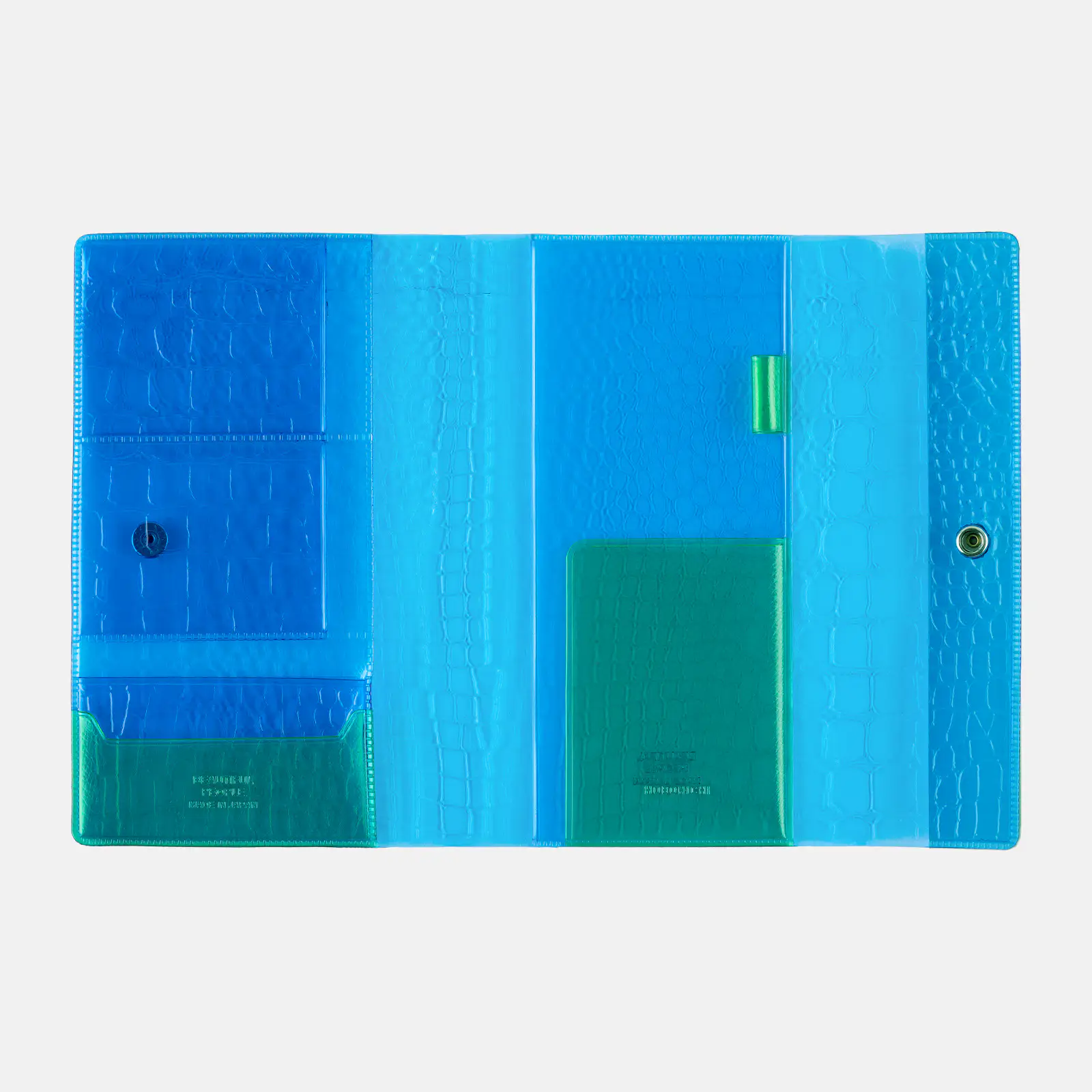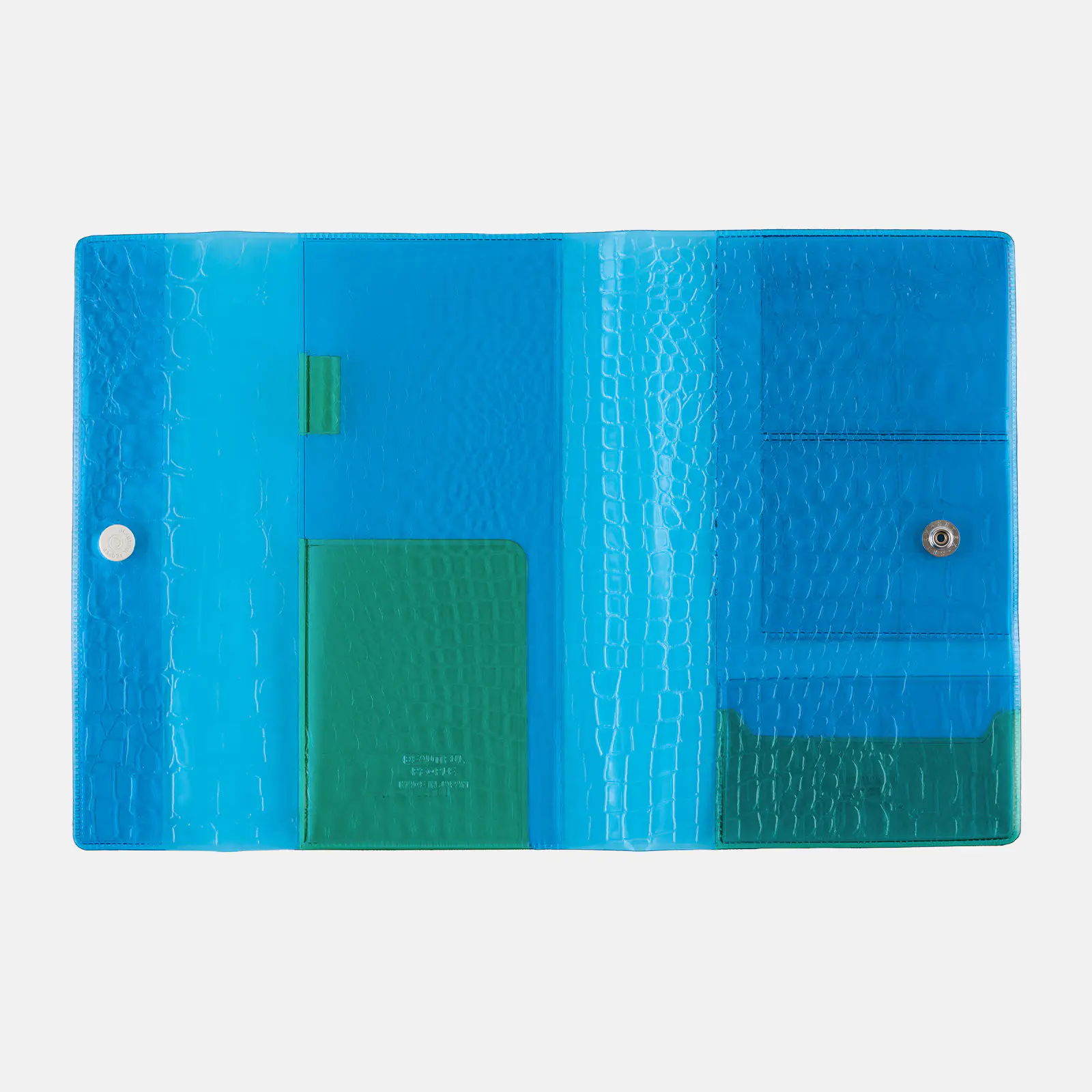 The cover features a crocodile-embossed pattern on PVC. By pairing the transparency of PVC with the embossed texture of natural leather, this design captures beautiful people’s signature sense of playful contrast.