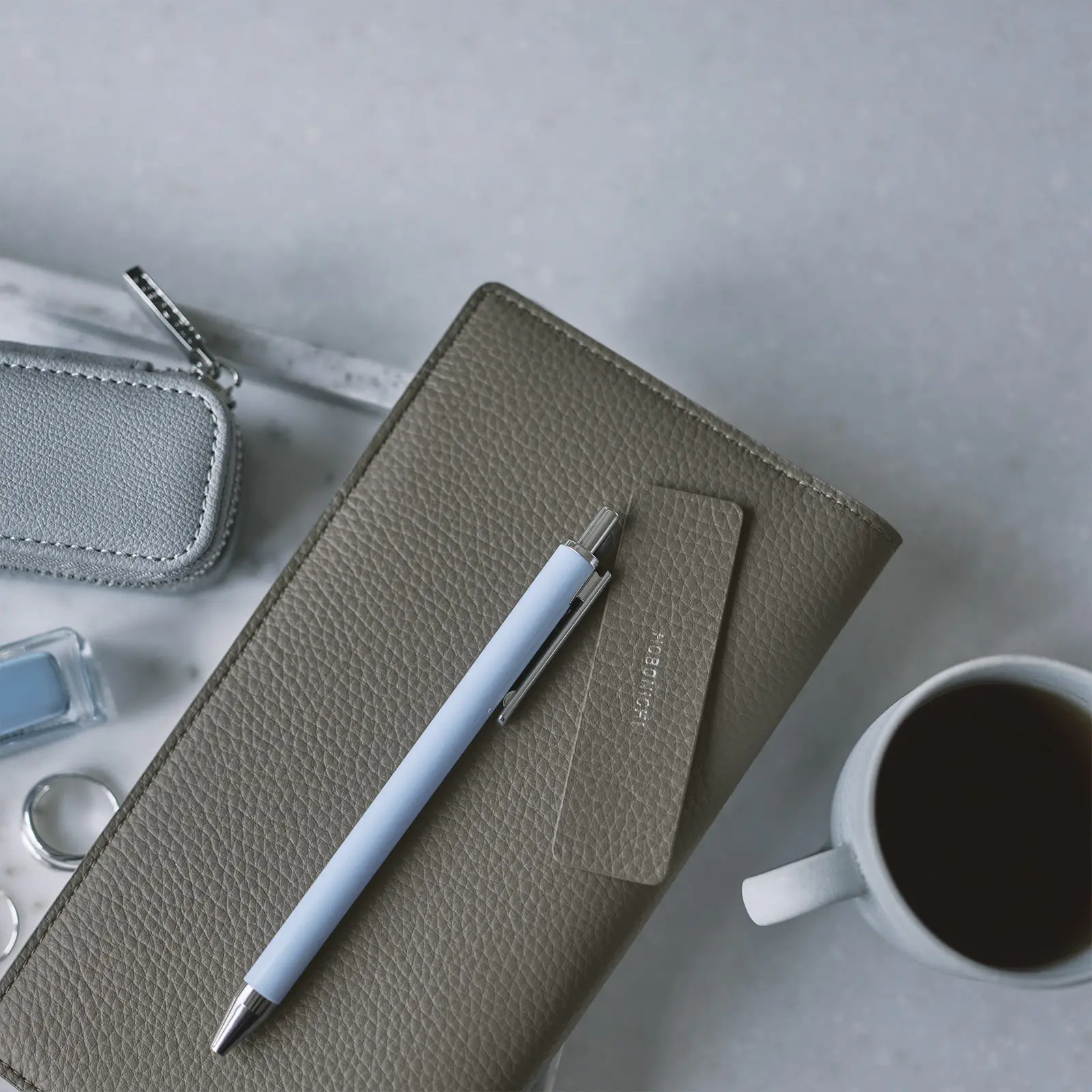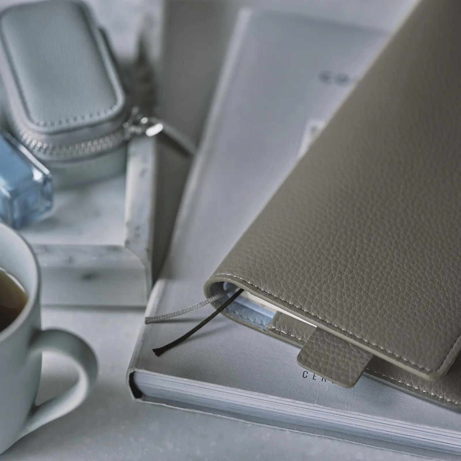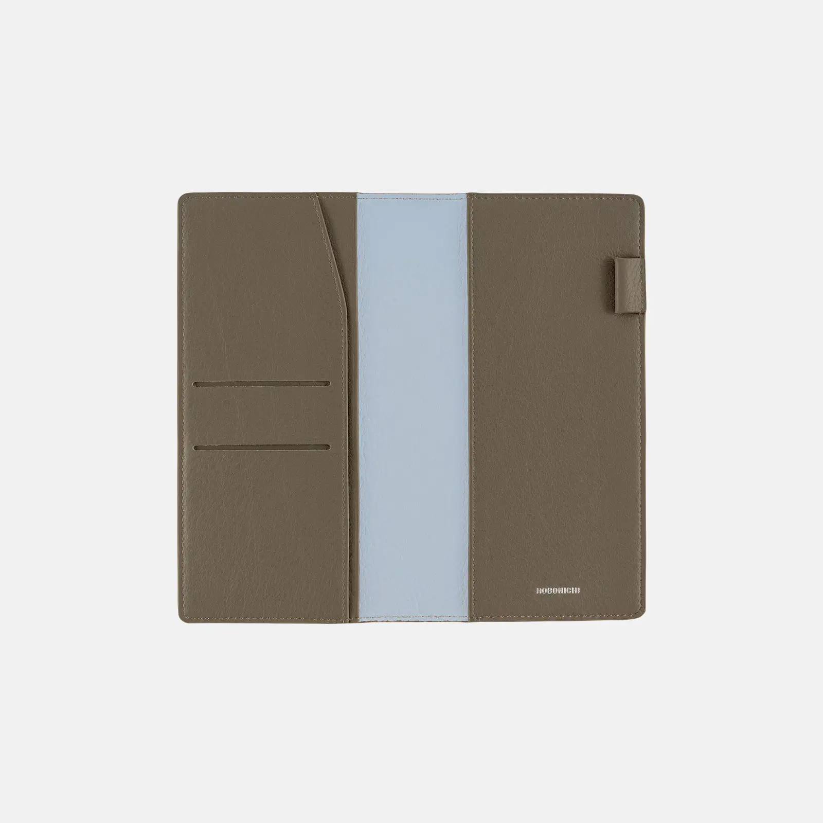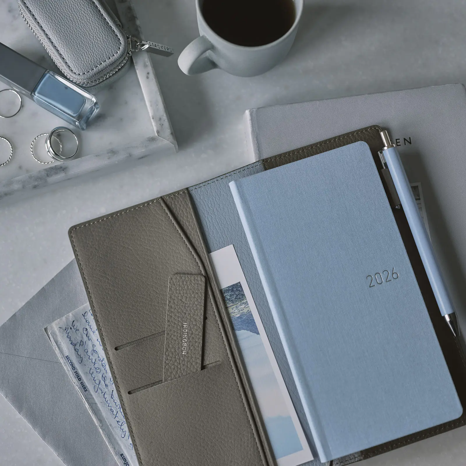 The front of the cover is in a warm gray, while the back is in a cool-toned light blue. A specialized process was used to create this dual-tone on one single piece of leather. The unique sleekness of the leather makes it soft to the touch, and thanks to its finely grained texture, scuff marks will be less visible.