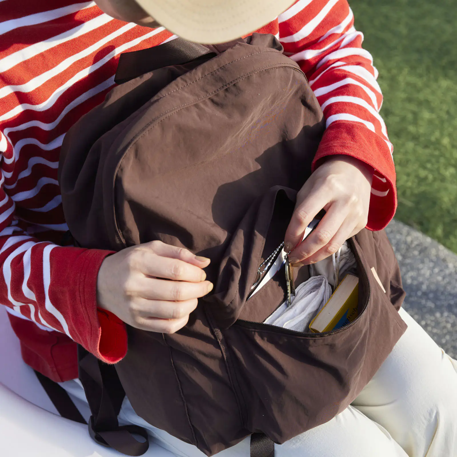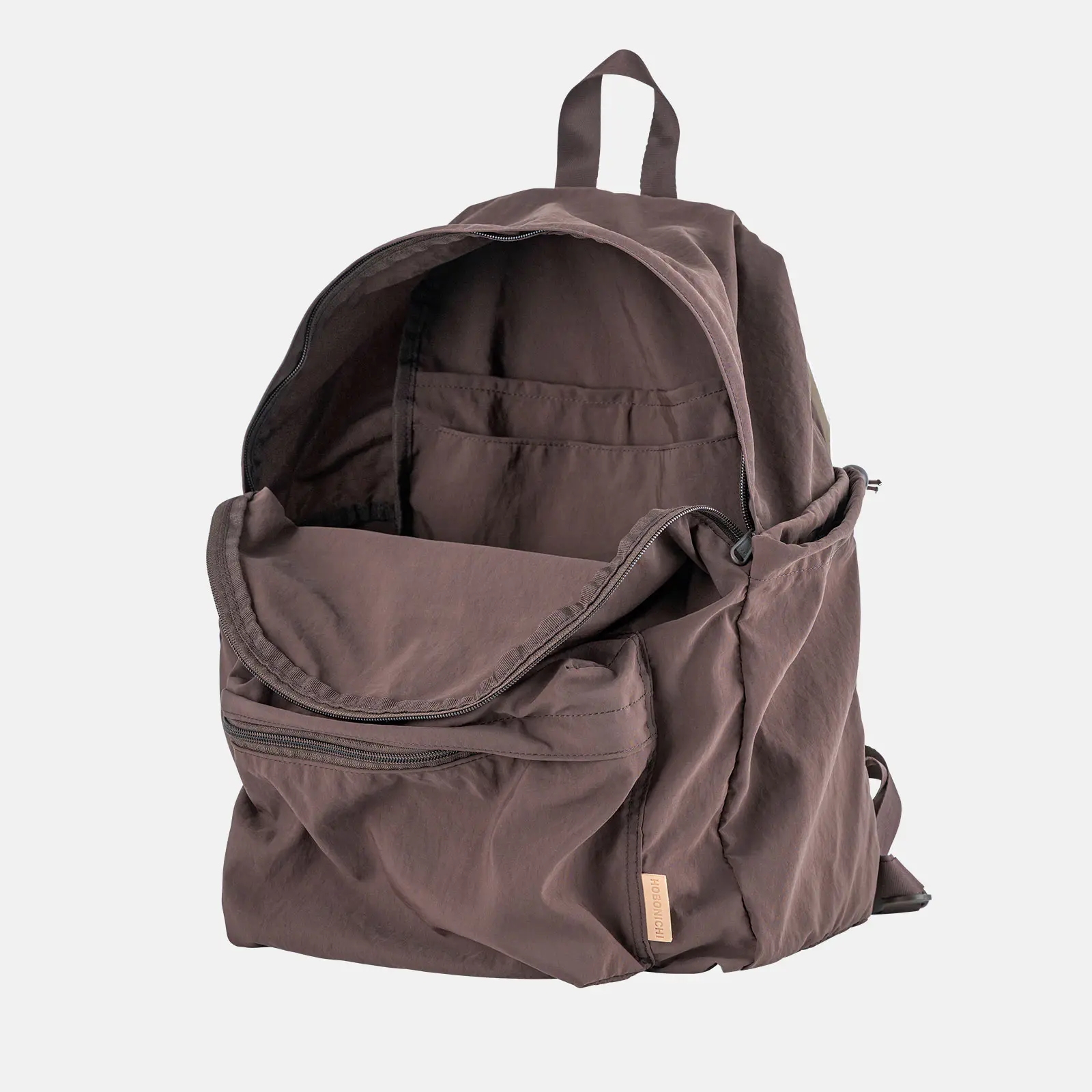 There are two layers to the backpack’s inner pockets. The back compartment fits a 13" laptop, while the front pocket is slightly shallower, making it perfect for storing items like the Drawer Pouch Áne.