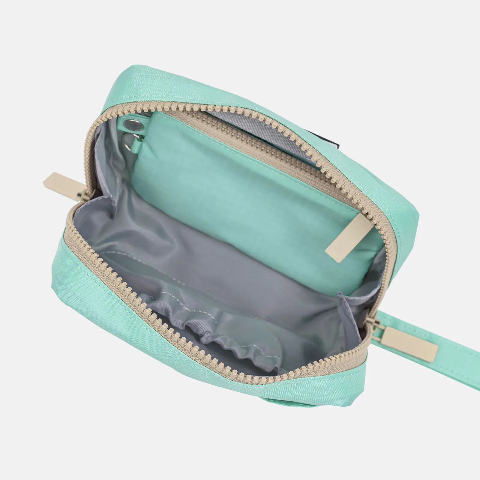 The double zipper allows the pouch to open completely to accommodate the generous space. Excluding any dividers in the pouch was a conscious decision, to keep a structure that can fit bulky items.