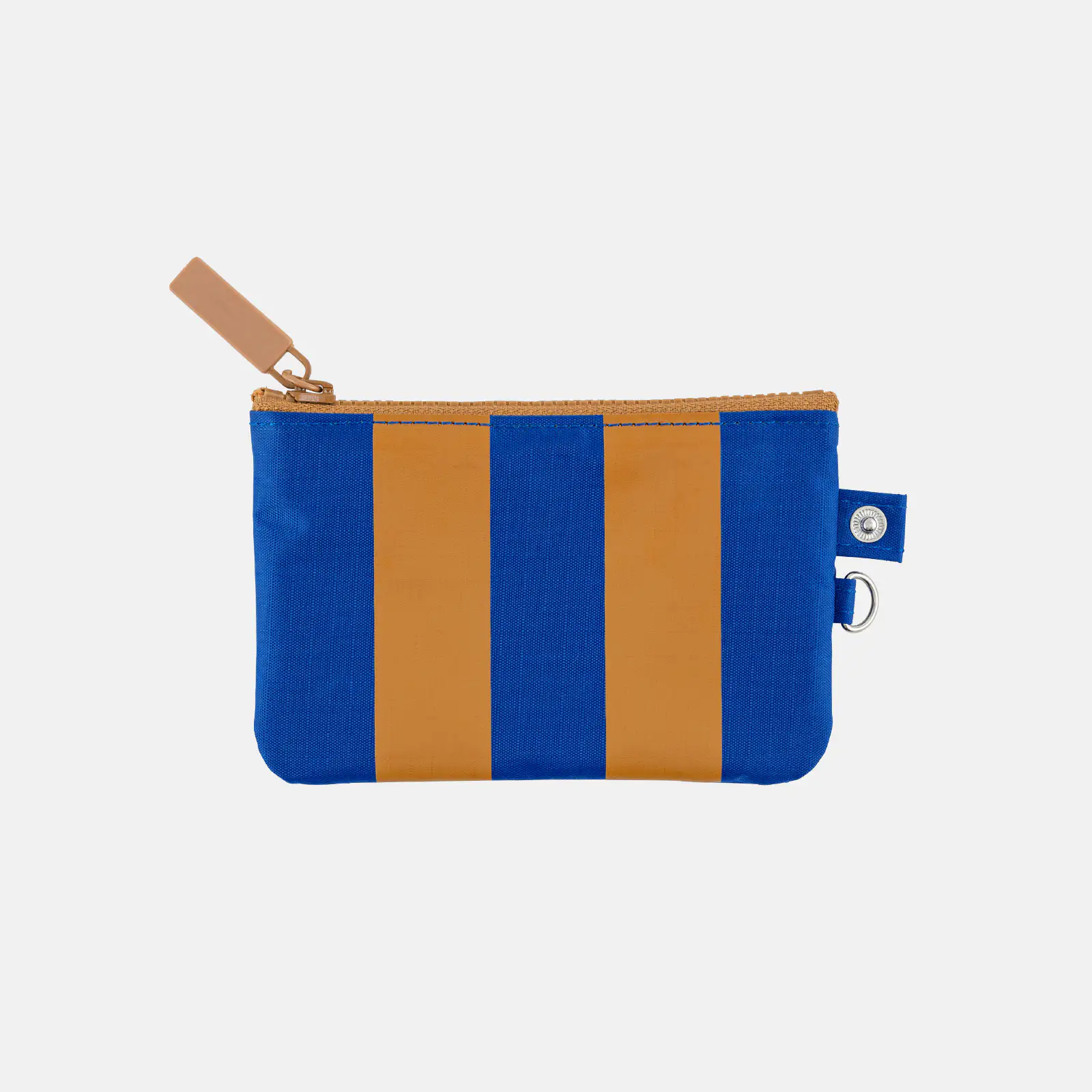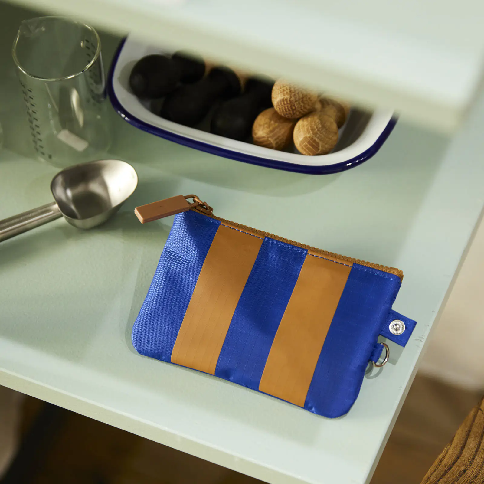 The “Box” type comes in two colorways: Stripes or Mint. Stripes has broad stripes in blue and caramel-color on the front, while the back is a solid blue. The zipper is caramel-color, and the interior is beige.