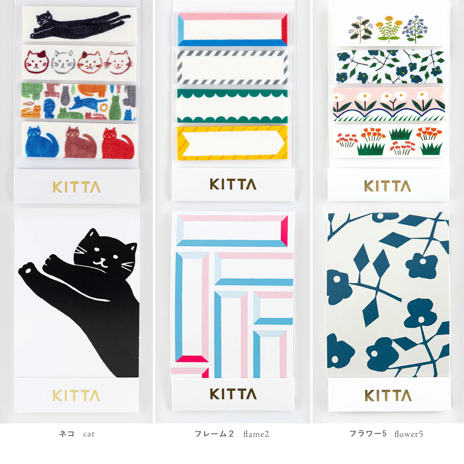 The Cat, Frame 2 and Flower 5 pattern sets are a traditional 15 mm width and carry the warm touch of hand-drawn illustrations. Each set offers a vibrant selection of 4 color variations. Each design includes 10 strips (40 total) that are 5 cm long for a perfect fit in your planner page. You can also fold the washi tape strip out from the edge of your page to make a decorative index tab.