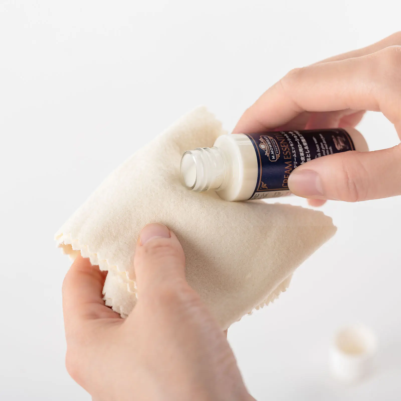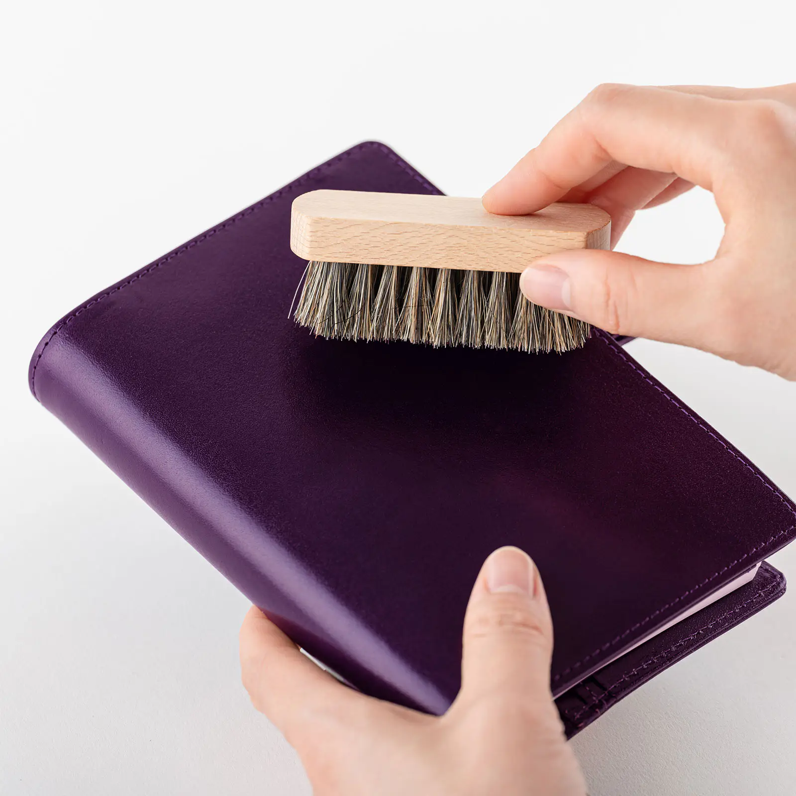 Use the Horse-Hair Brush to brush away the dust and put on the Essential Cream to the Polishing Cloth to apply to the leather products to polish it.