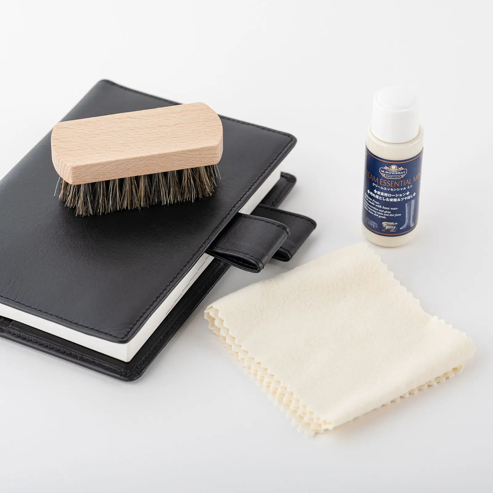 There are three items in this set. The Essential Cream (mini size) that contains beeswax gives the leather a bright, natural shine by replenishing the health of the leather and polishing away light grime. The Polishing Cloth is made from cotton and has raised fibers on both sides and polishes away grime to clean the surface with a shiny finish. The Mini Horse-Hair Brush uses natural horse hair and can be used to brush away the top layer of dust and grime from the leather before applying the cream.