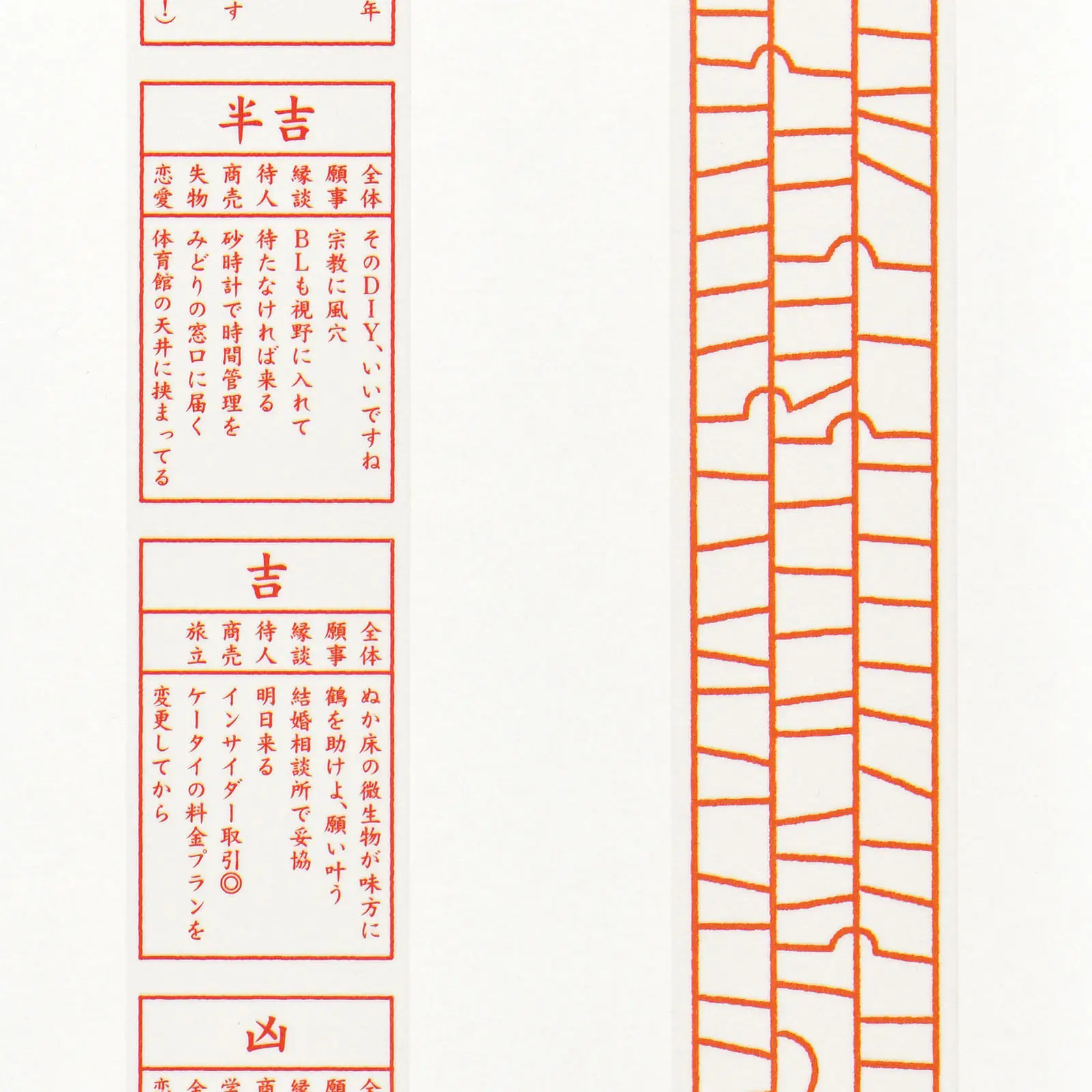 These washi tape stickers are vertically printed with omikuji fortunes and and amidakuji, a Japanese method of making random decisions.