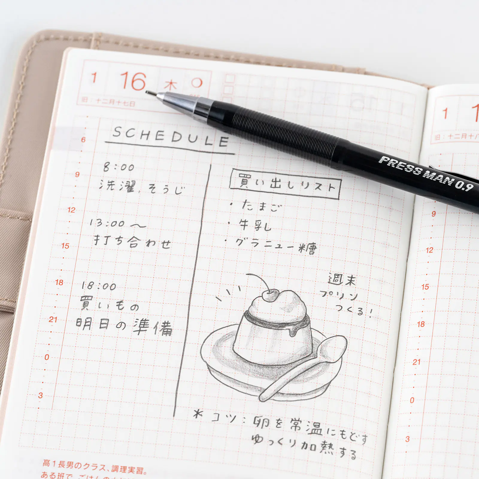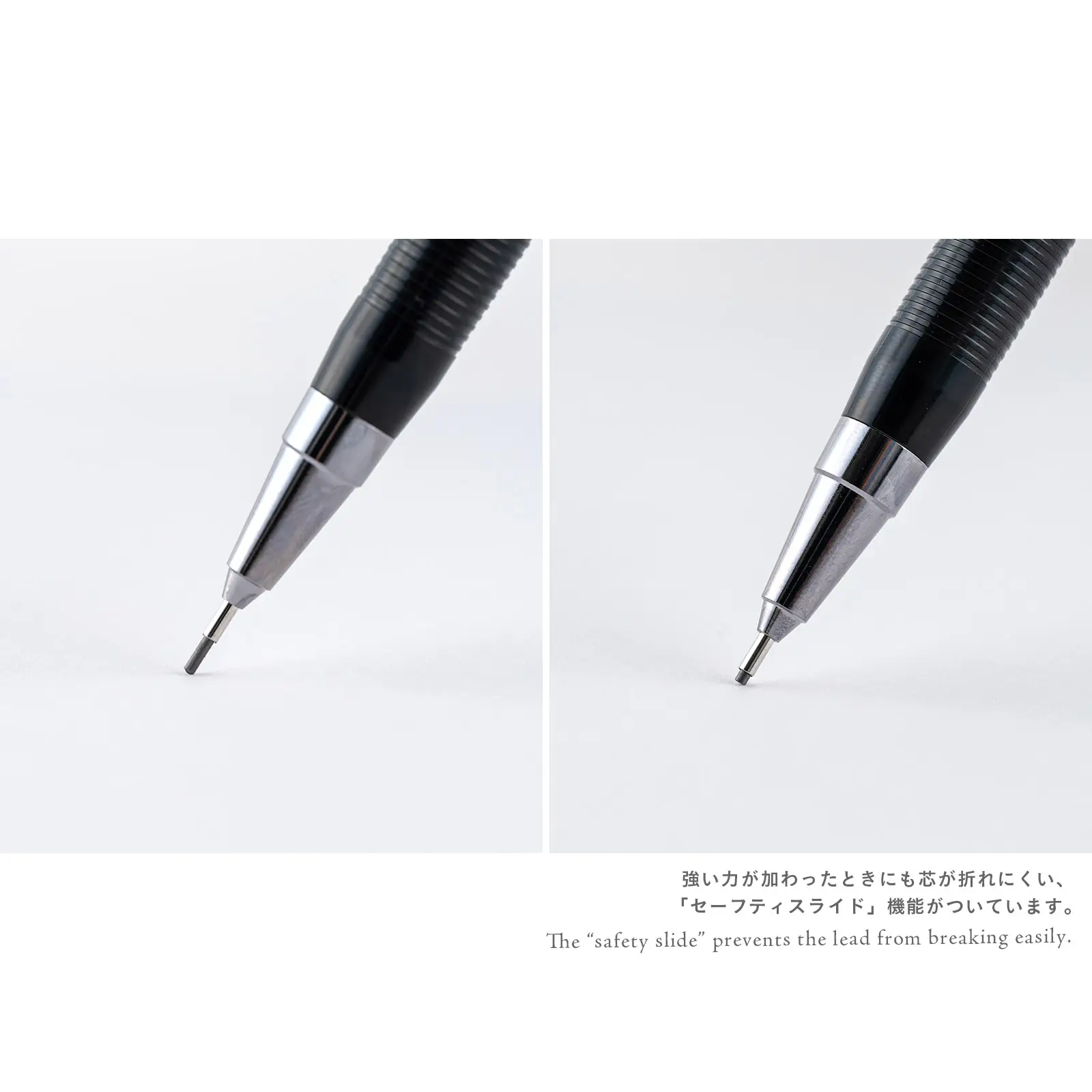 This mechanical pencil has 0.9 mm, 2B lead that’s an original product of the pencil and writes especially smoothly. The “safety slide” on the pencil tip allows users to put pressure into the pencil without worrying about breaking the lead. And while traditional lead refills are usually about 6 cm long, the Press Man lead refills are 10 cm long and last much longer.