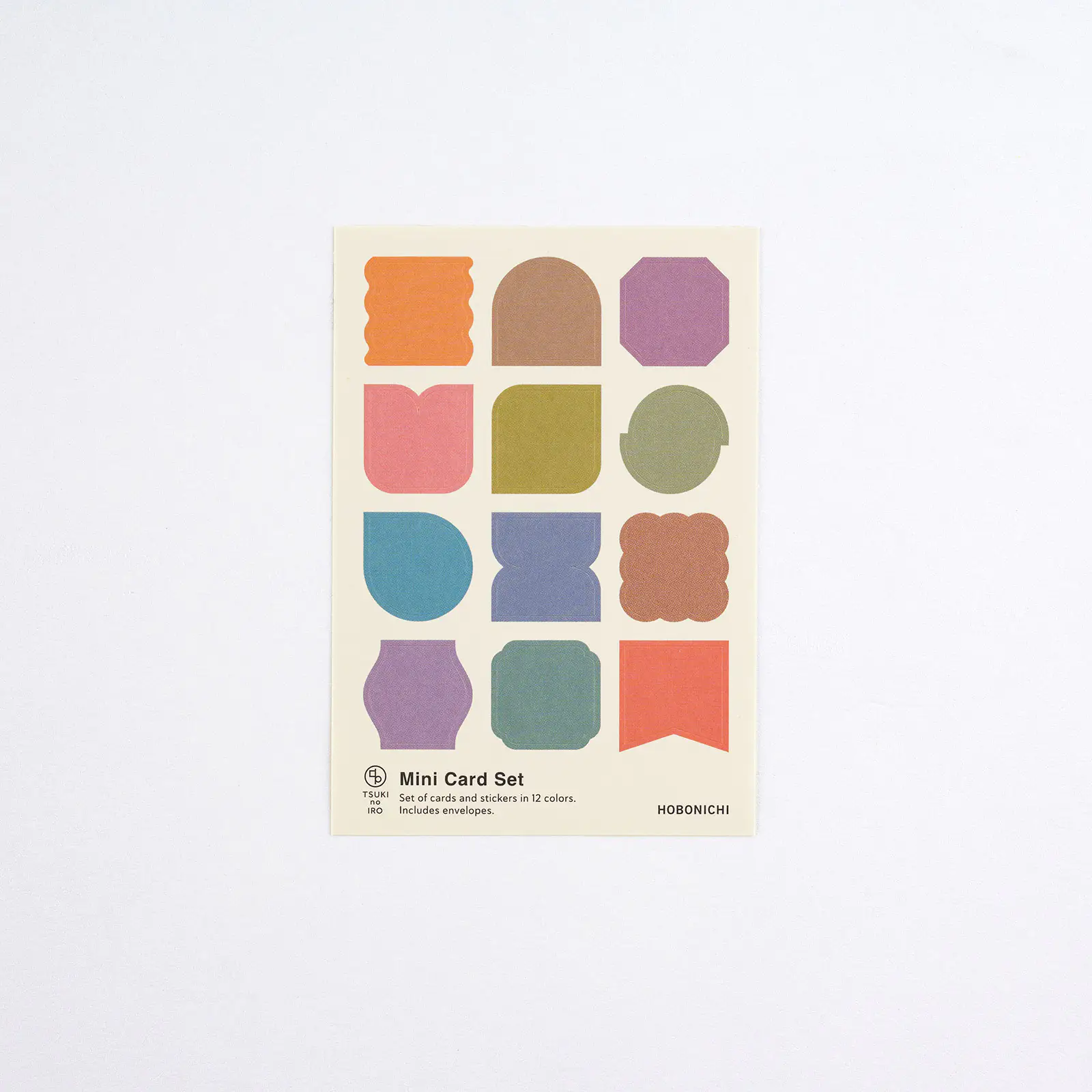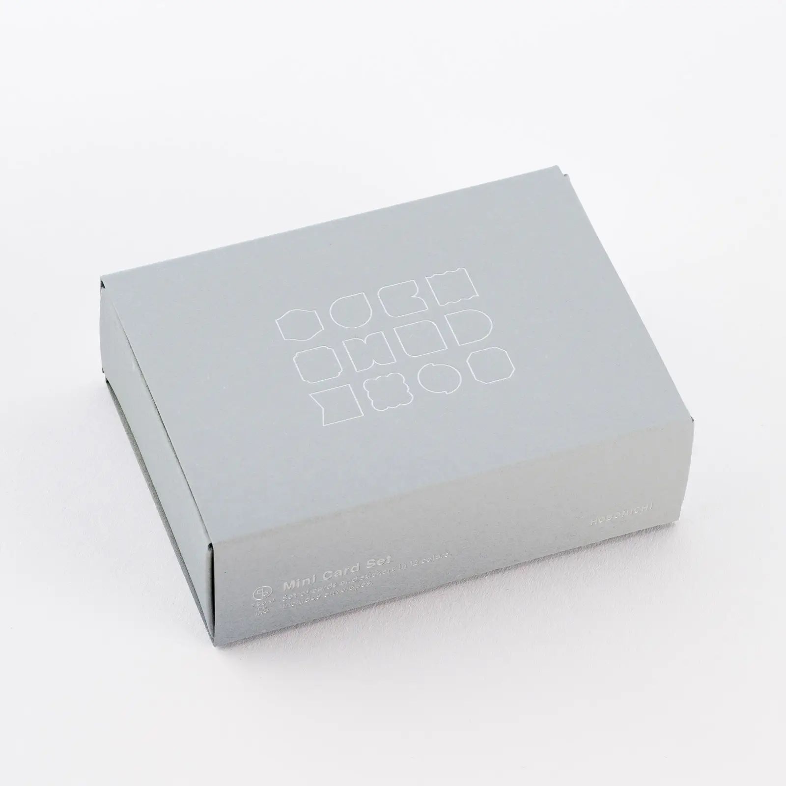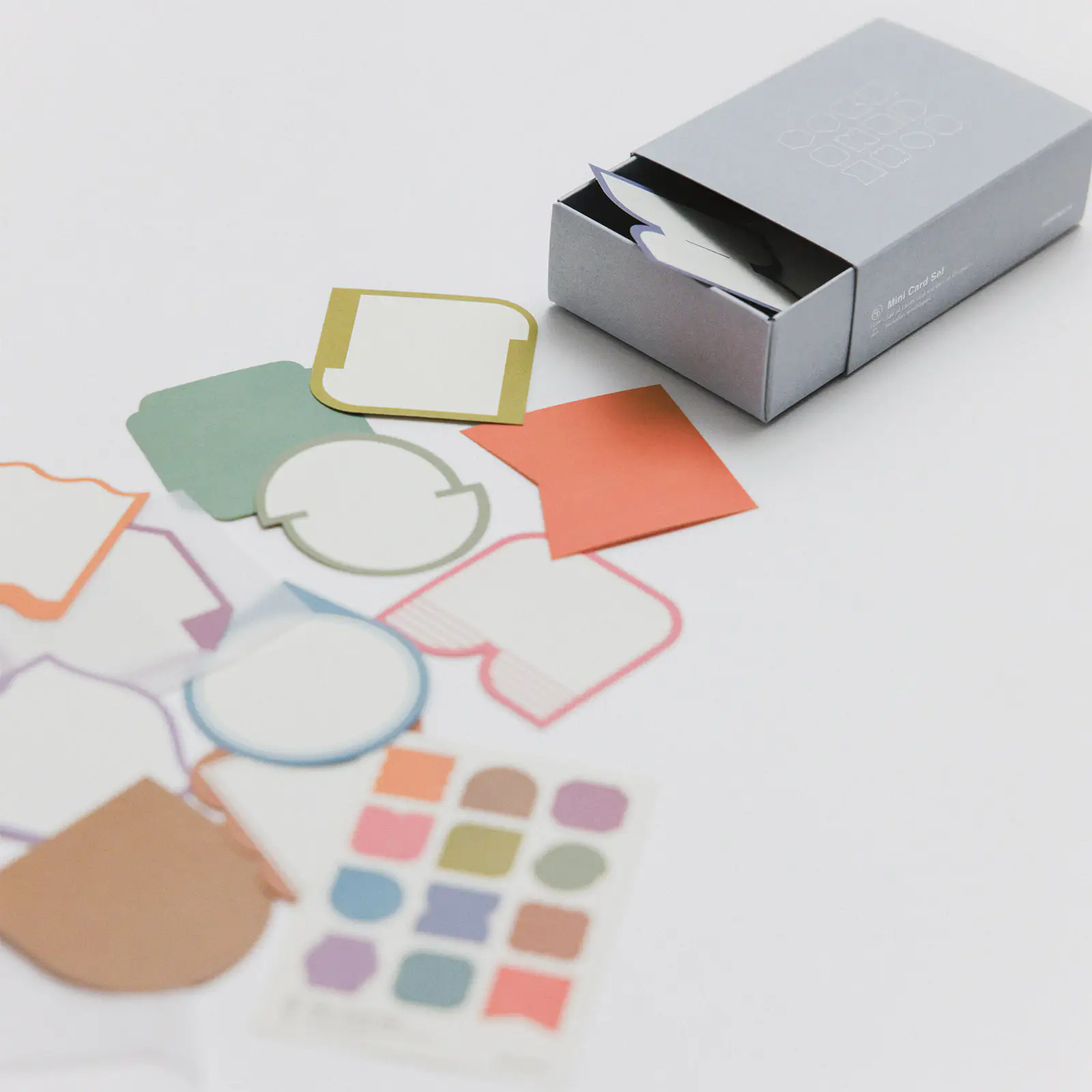 This Mini Card Set includes 12 playful and unique card shapes, with two of each design. The set also comes with a sheet of matching sealing stickers and six translucent envelopes, all packaged in a sleeve-style box decorated with silver foil featuring the shapes of the cards.