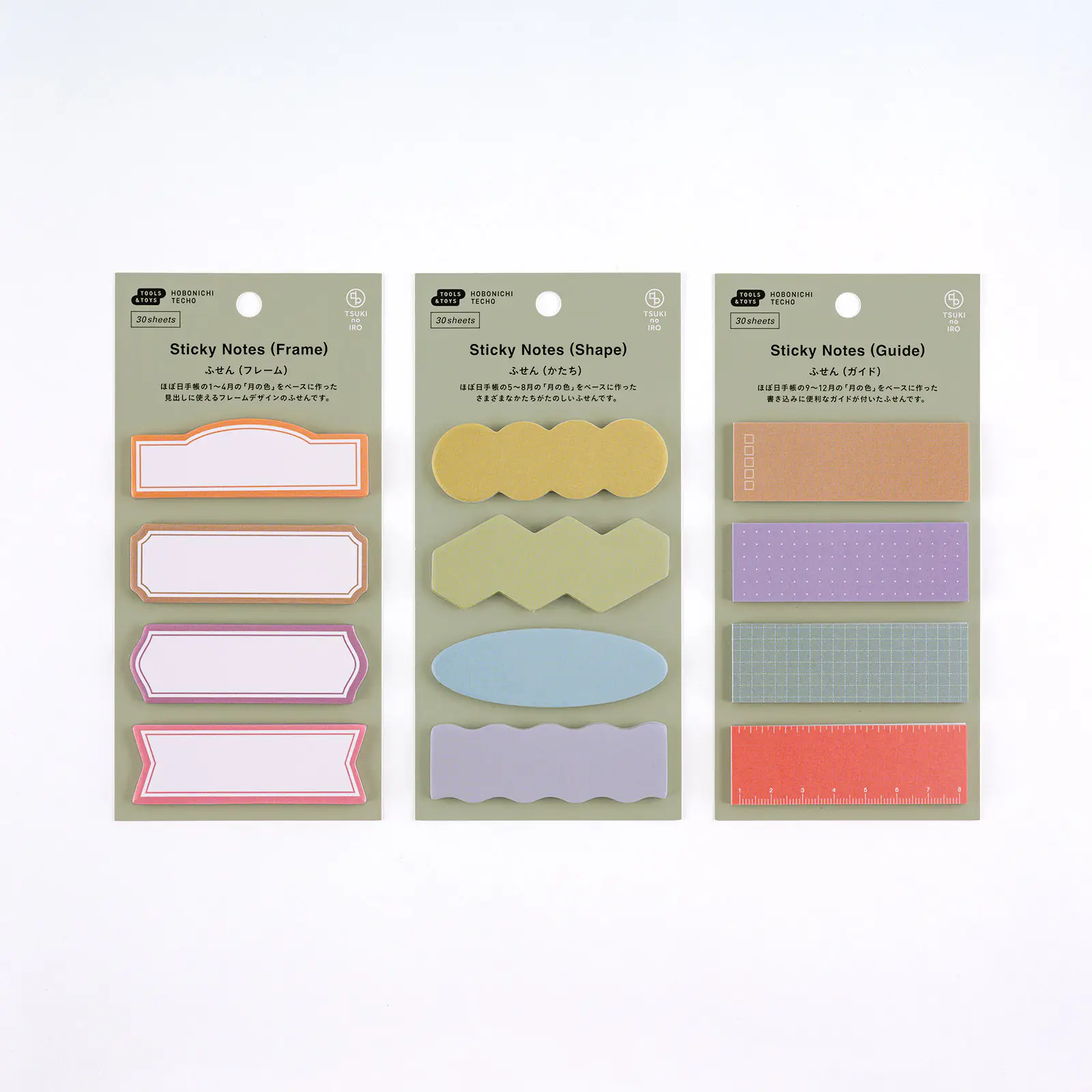 The TSUKI no IRO Sticky Notes are conveniently sized for easy writing and come in three types: Frame, Shape, and Guide—each including four unique designs in a set.