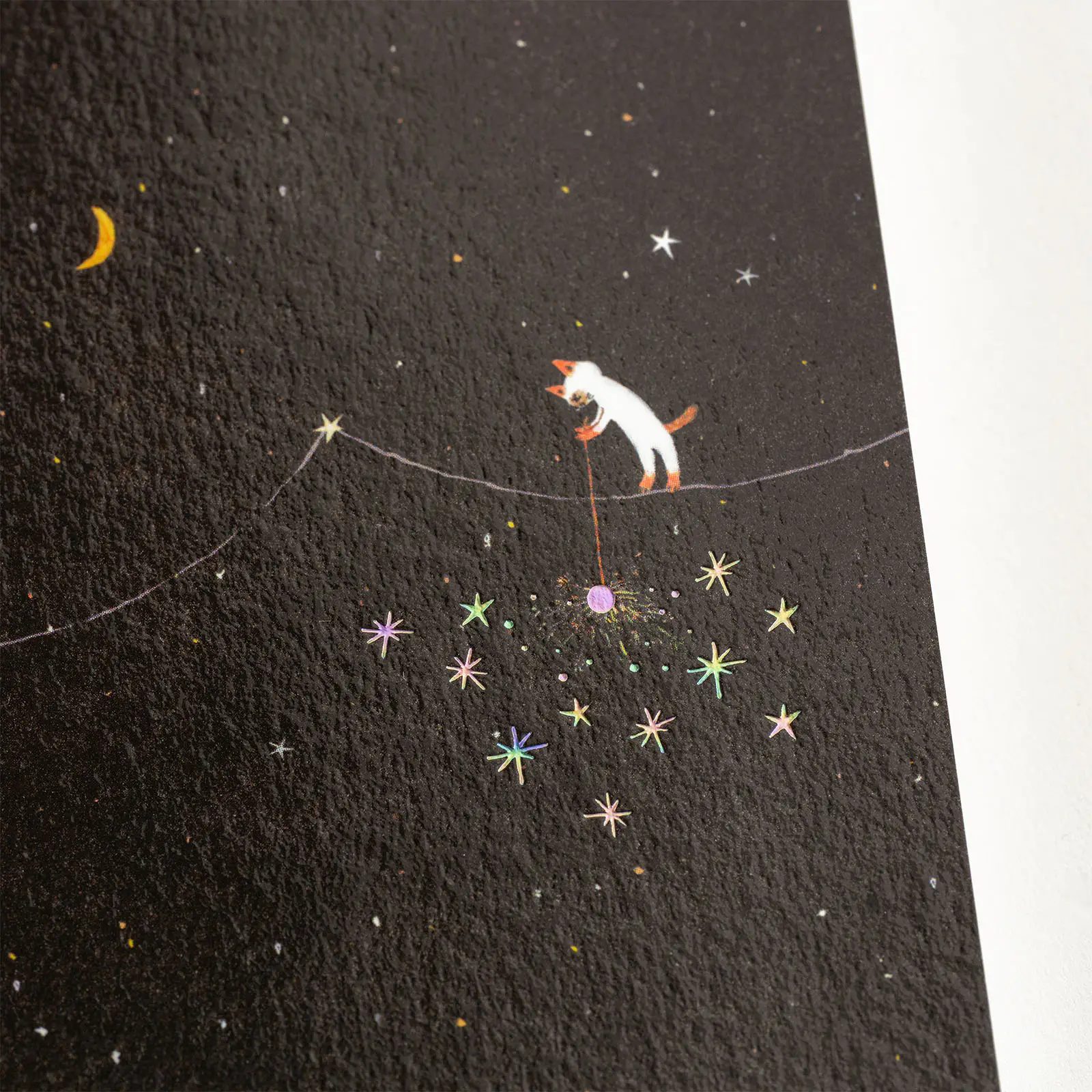 The fireworks from the sparklers are depicted in aurora-colored foil, and the color shifts based on the angle at which you view the artwork, shining delicately as it catches your eye.