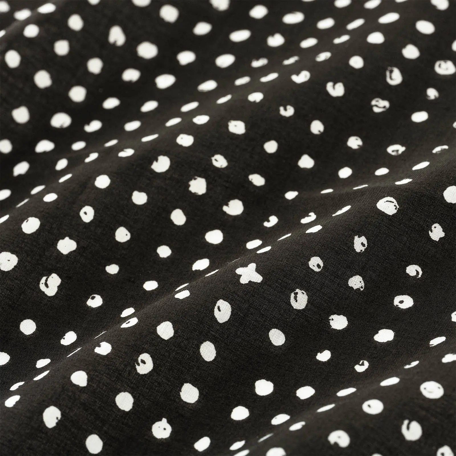 Painted with free-flowing brushstrokes, white dots stand out boldly against a black background. Though the design is refreshingly simple, with no extra embellishment, the subtle wavering and fading of the hand-drawn lines bring a gentle warmth to the overall look.