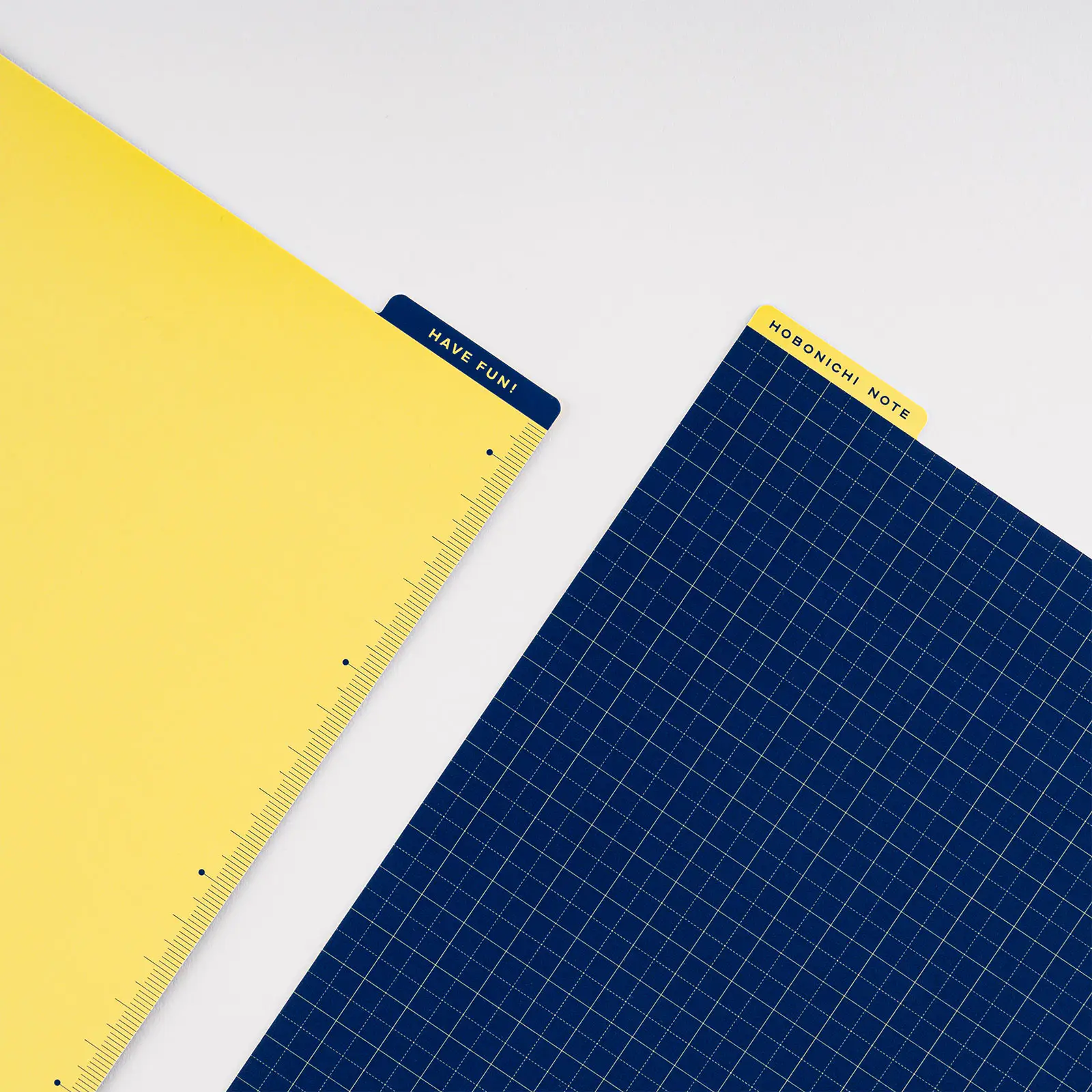 The front has a 5mm grid with a navy background. The back is a plain lemon yellow, with a 1 mm scale on the long side that can be used as a ruler. The reversible design lets you use it according to your mood- navy when you want to be concentrated and lemon yellow when you want to have a enjoy with a cheerful mind.