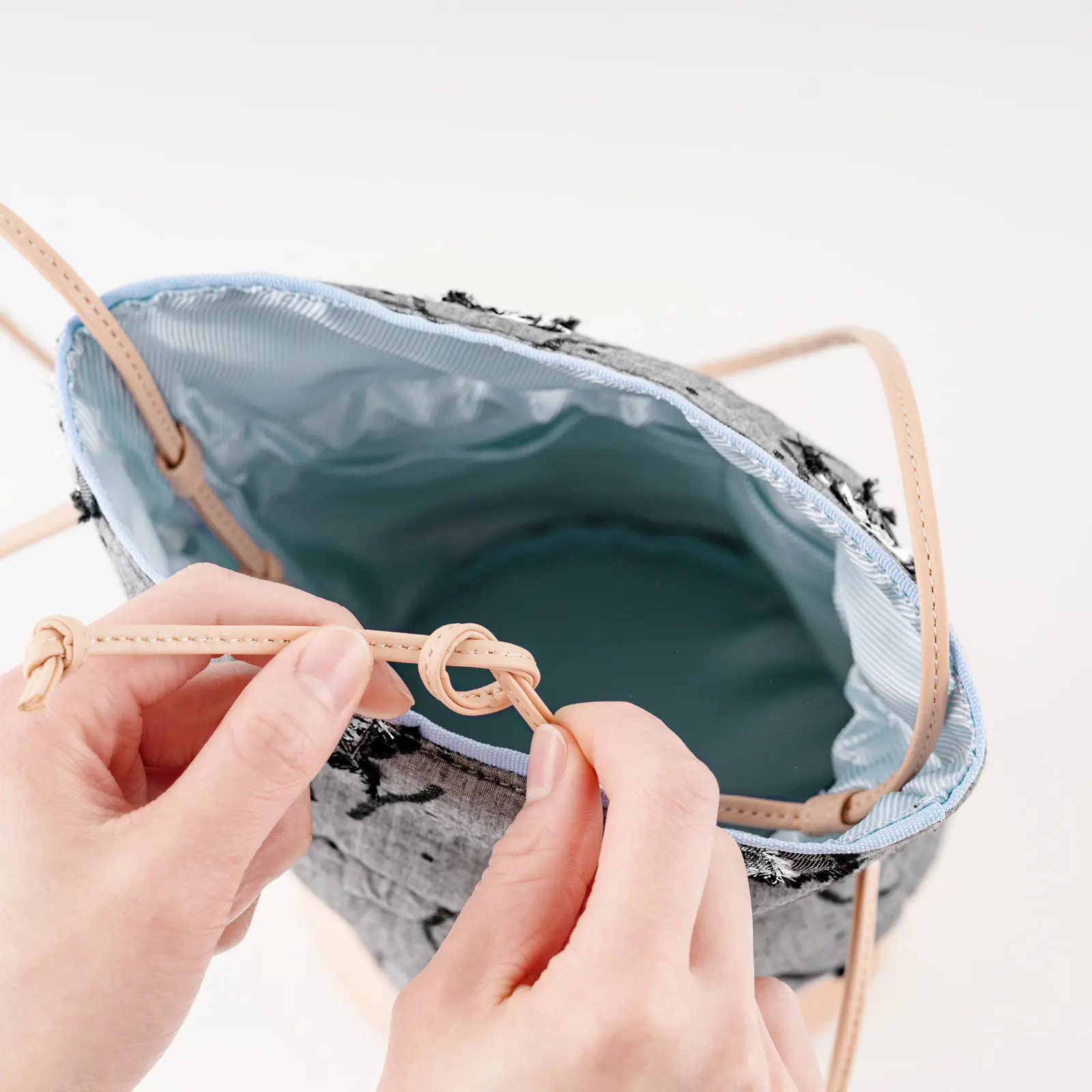 Tie the drawstring tightly shut to give this pochette a cute silhouette. You can also adjust the shoulder strap to your preferred length. The bag interior has a refreshing light blue striped design, and the sides of the bag contain two pockets.