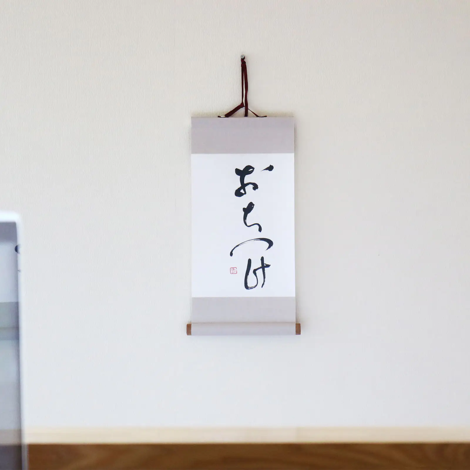 This is a hanging scroll that allows you to take in the spirit of “Ochitsuke” in your daily life. It will calmly watch over yourself, your family, your coworkers and your friends at at moments when you tend to rush or get carried away by emotion. Its compact size (W: 175mm x H: 320mm / W: 6.9" x H: 12.6") allows you to place it where it will always be within eyesight, such as your living room, entrance, or by your desk. Hang it up by hooking its string on a hook or push pin.