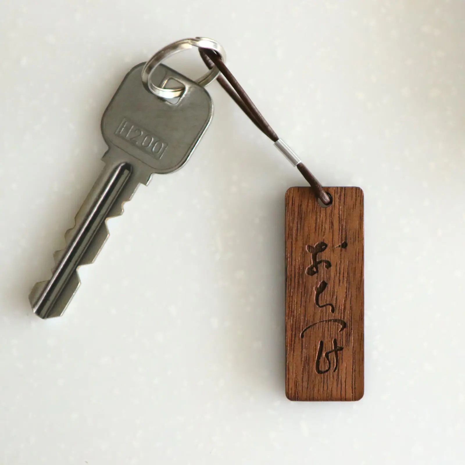 The words “Ochitsuke” are engraved in a deep brown color using laser machining on a key ring made of walnut wood. Keep this on your key or something that you carry around with you to keep it within eyesight. Since it’s imprinted, it’s also calming to the touch. Use it to accent your handbag.