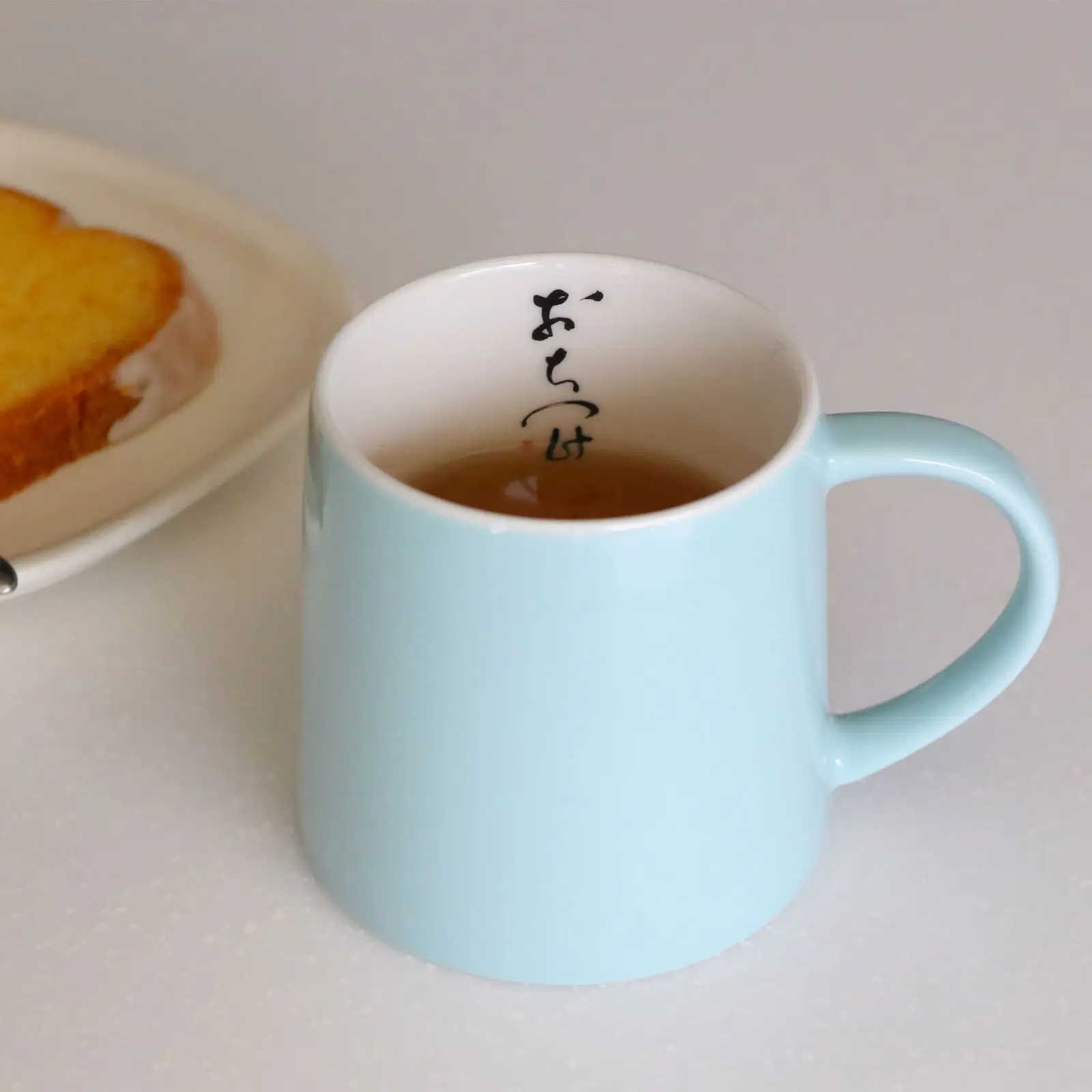 When you are about to rush or want to stay focused, take a break drinking tea or coffee with this mug. Its trapezoid shape with a wide base makes it hard to knock over accidentally. The outside features a fresh and calming light blue. The word “Ochitsuke” will be within eyesight by looking at the inner rim of the mug.