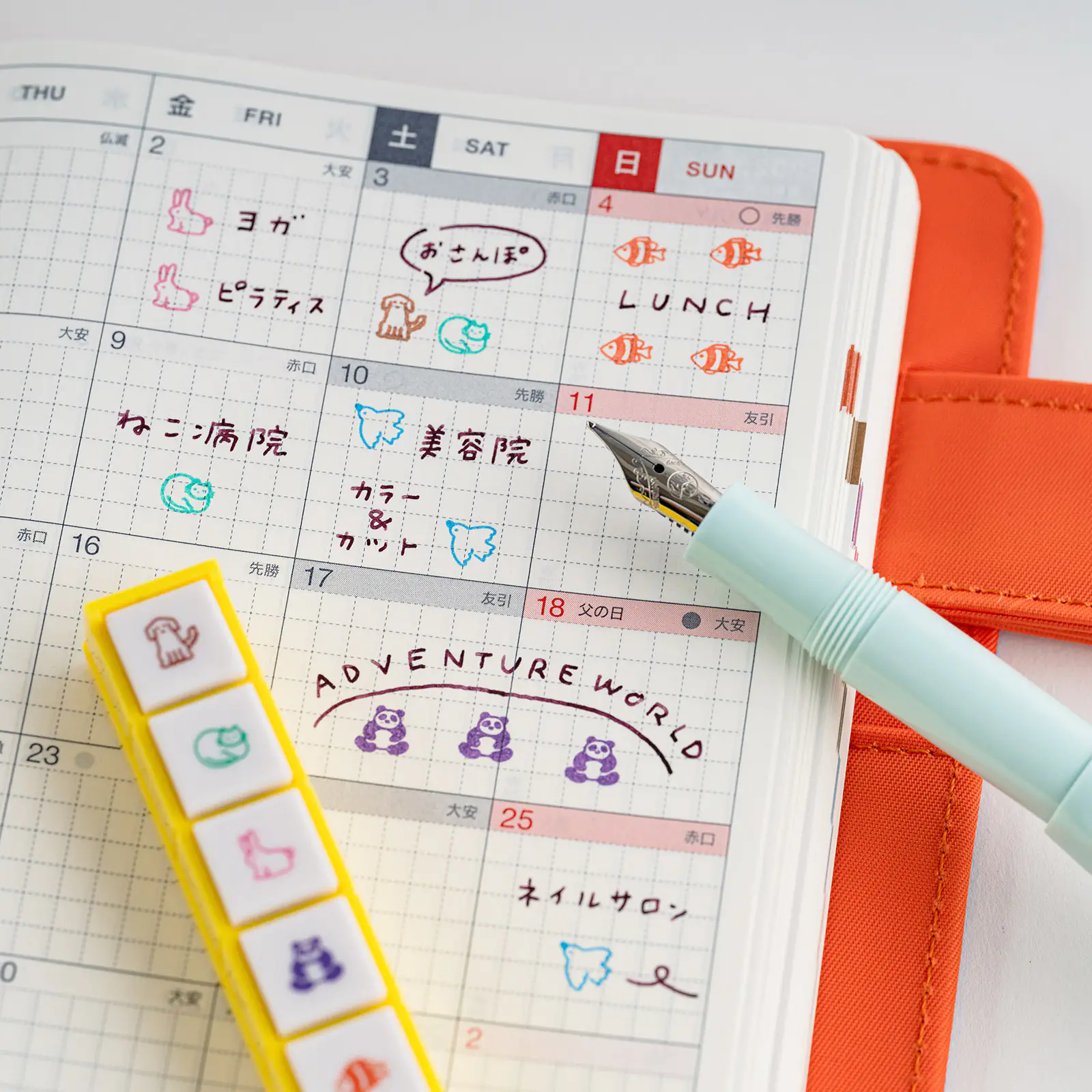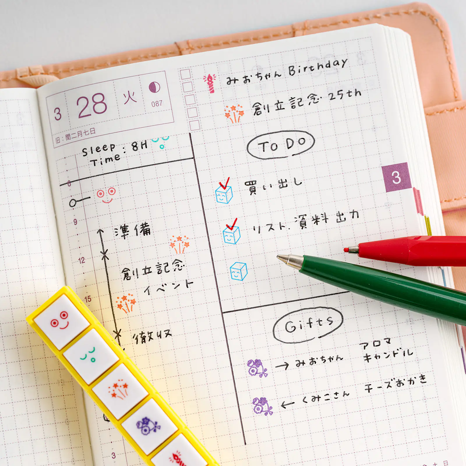 Each stamp size is 5.5mm and is quite small. It’s easy to use on the monthly calendar page to manage your schedules or add as an accent on your daily pages. Because each stamp uses a different color ink, it will add a fun touch of color to your techo. You can use them by layering colors since the ink does not smudge.