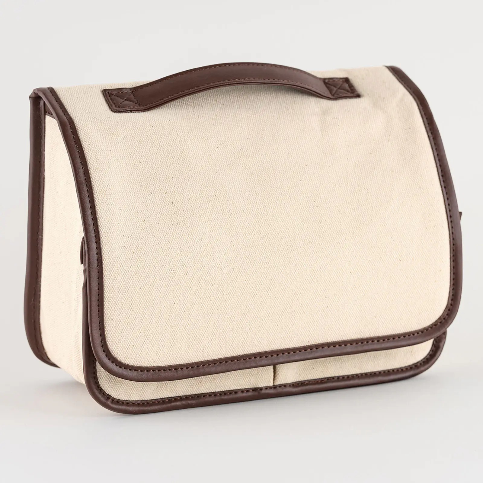 Canvas: Ivory Brown is made with a natural canvas material paired with deep brown piping. The interior is also deep brown, giving the pouch a simple yet sophisticated design.