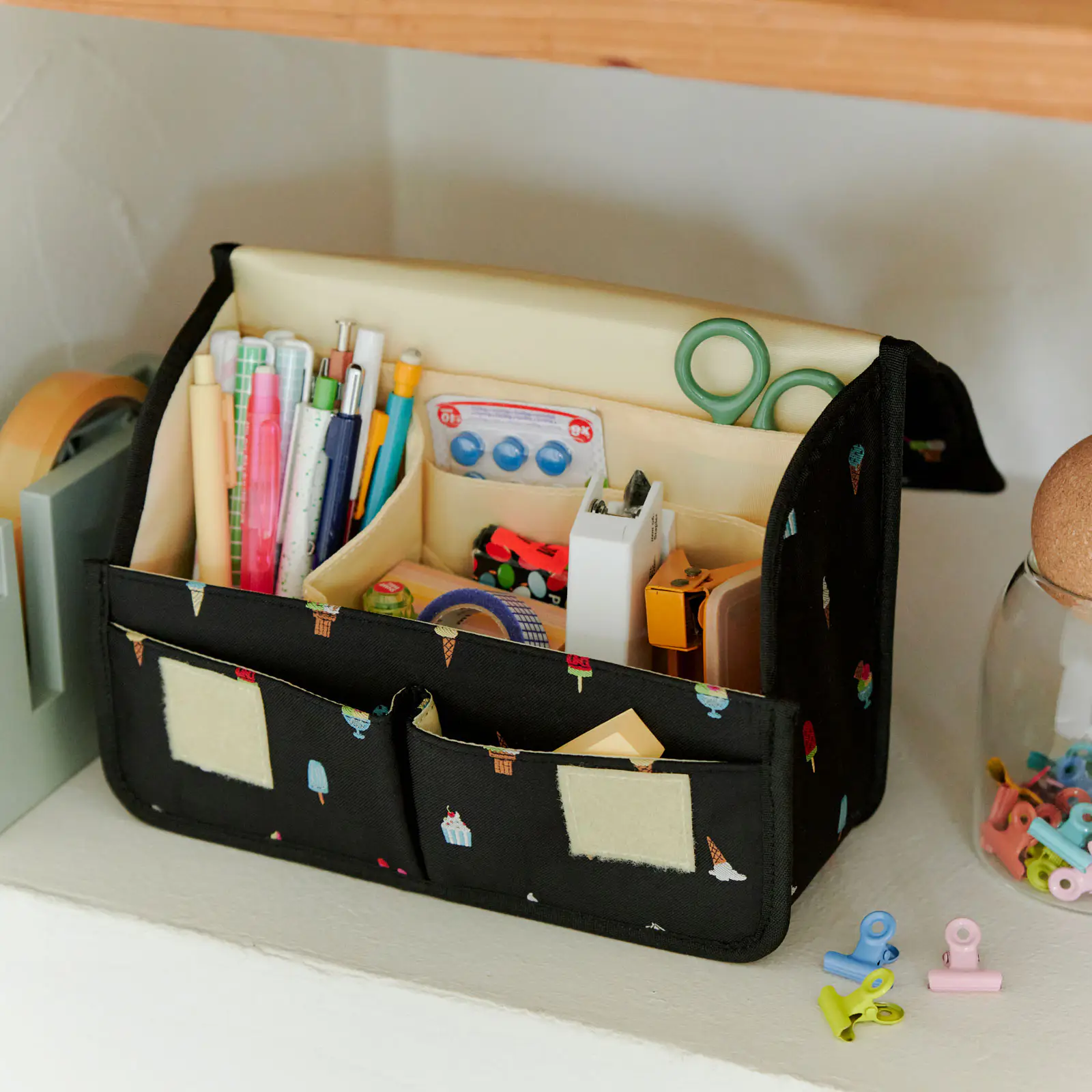 The interior also has pockets of various sizes that can store items based on their size and shape. The largest pocket is long enough to hold a memo pad or ruler. The small pocket can store sticky notes, cards, stickers, and other slim objects. The left pocket can hold pens.