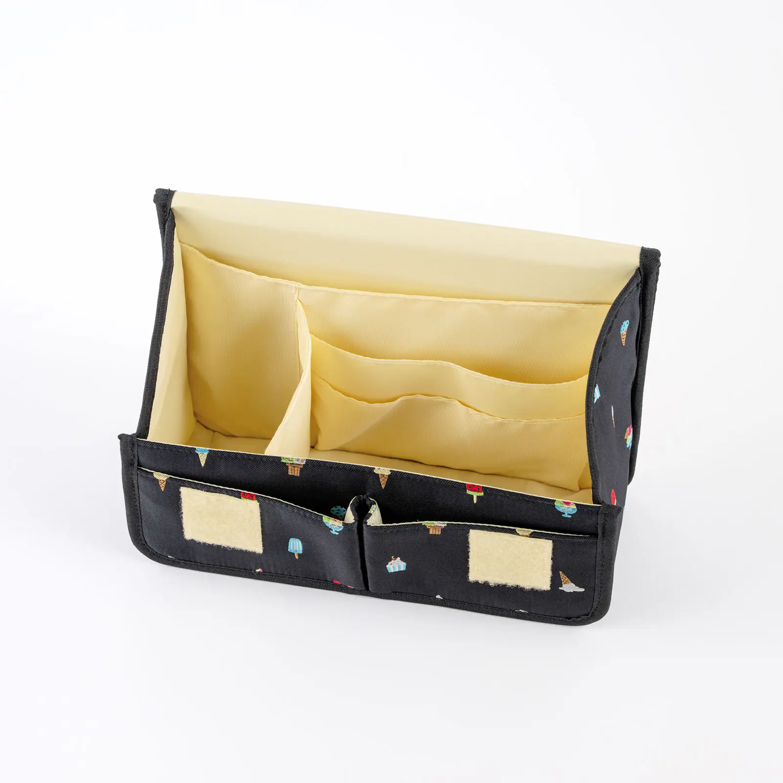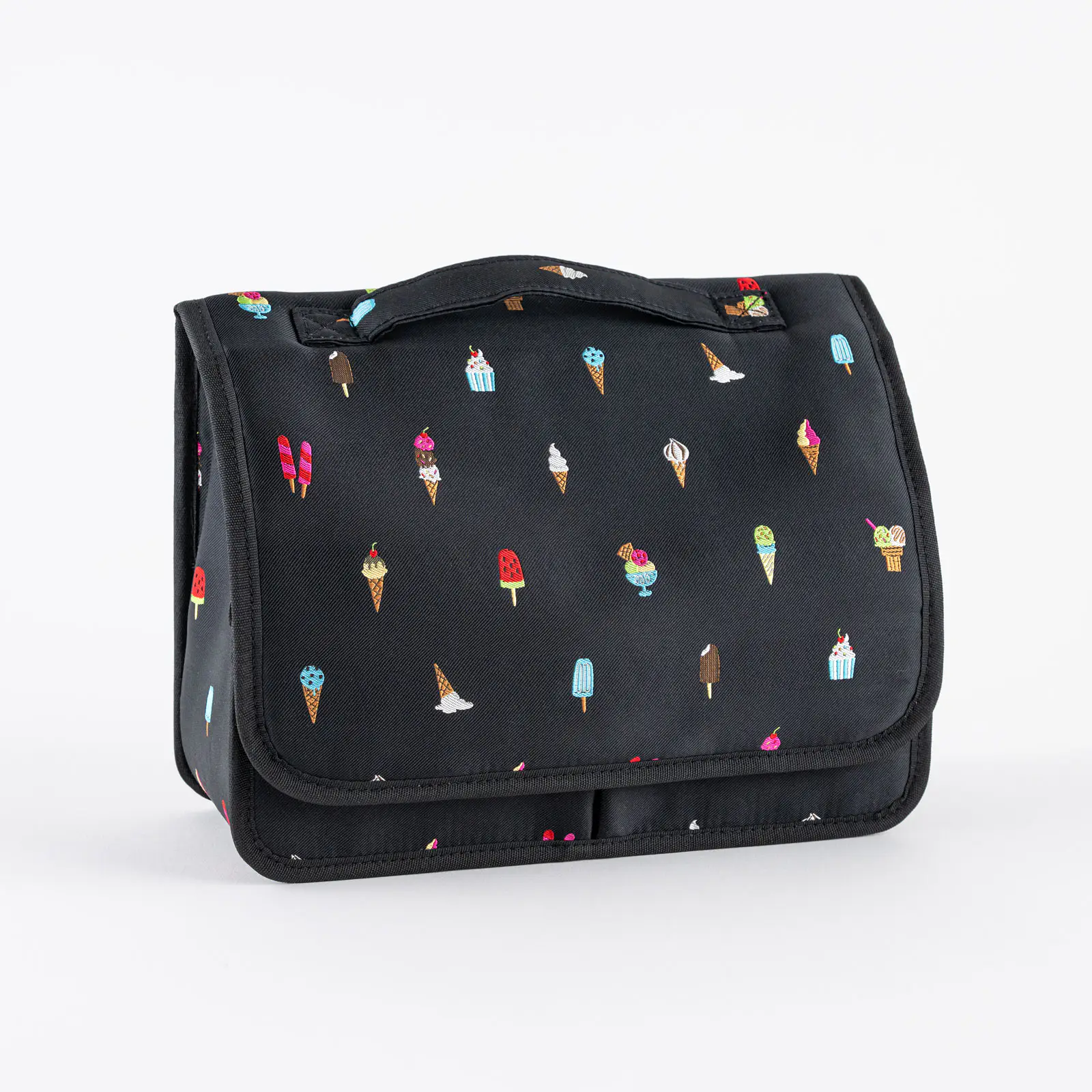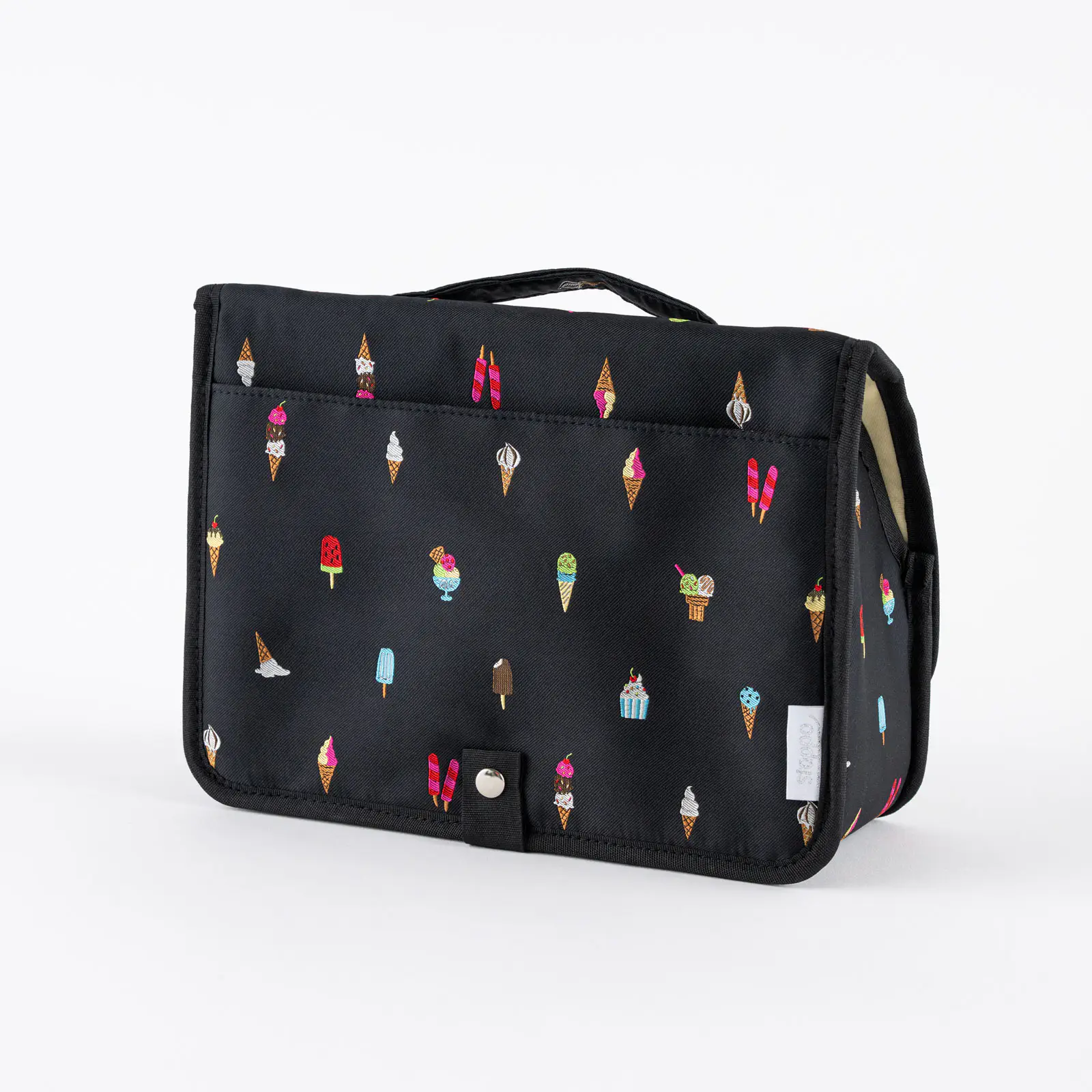This design features a cheerful lineup of colorful ice creams set against a black background. Each delicious-looking treat is intricately woven in fine detail. The interior comes in a cream color that looks just like vanilla ice cream.