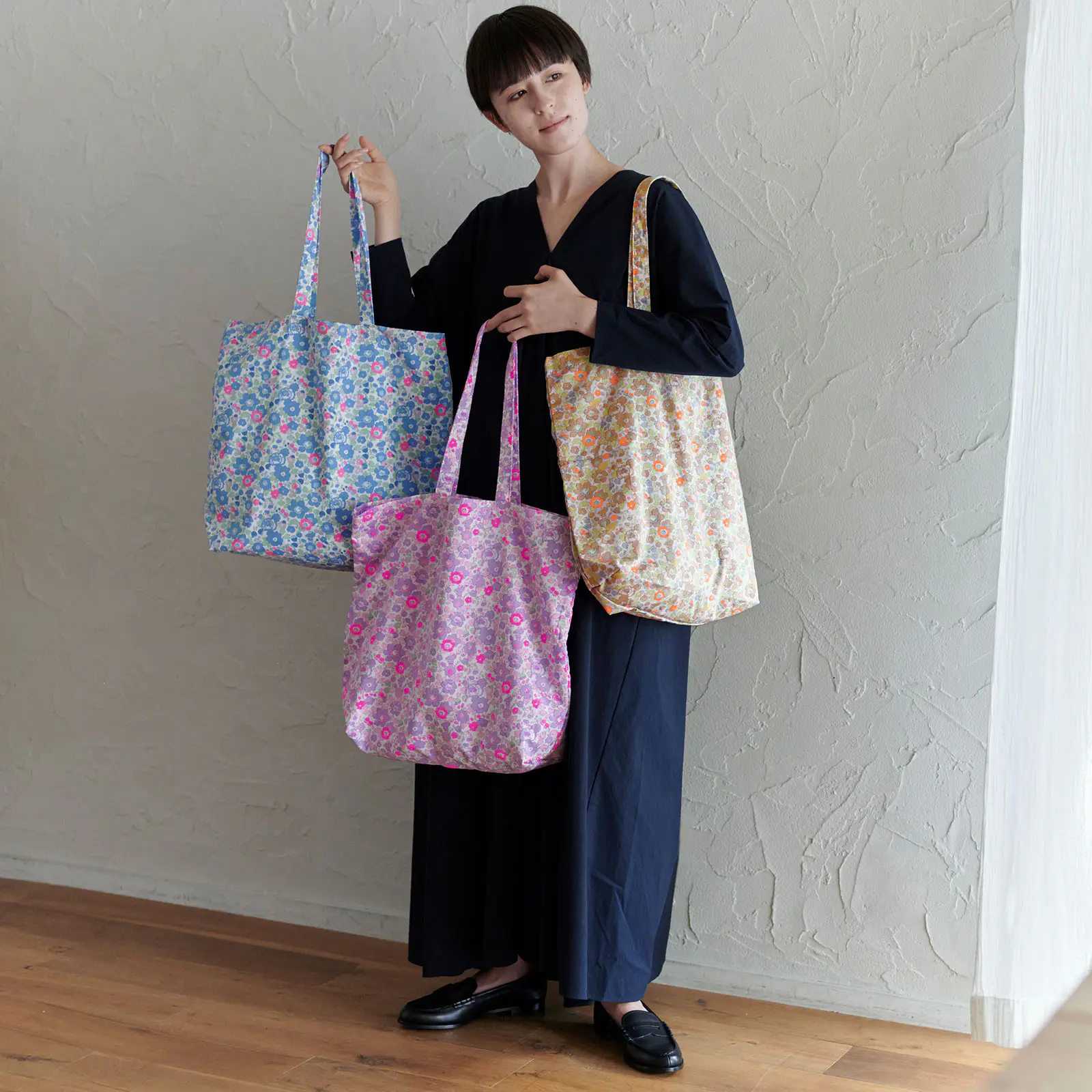 This tote bag is made from a beautiful textile from the venerable British fabric brand Liberty Fabrics. The fabric matches that of the Hobonichi Techo covers also available this year, but while each techo cover size offers its own colorway, the tote bag is available in all three colors so you can pair it with your techo cover.