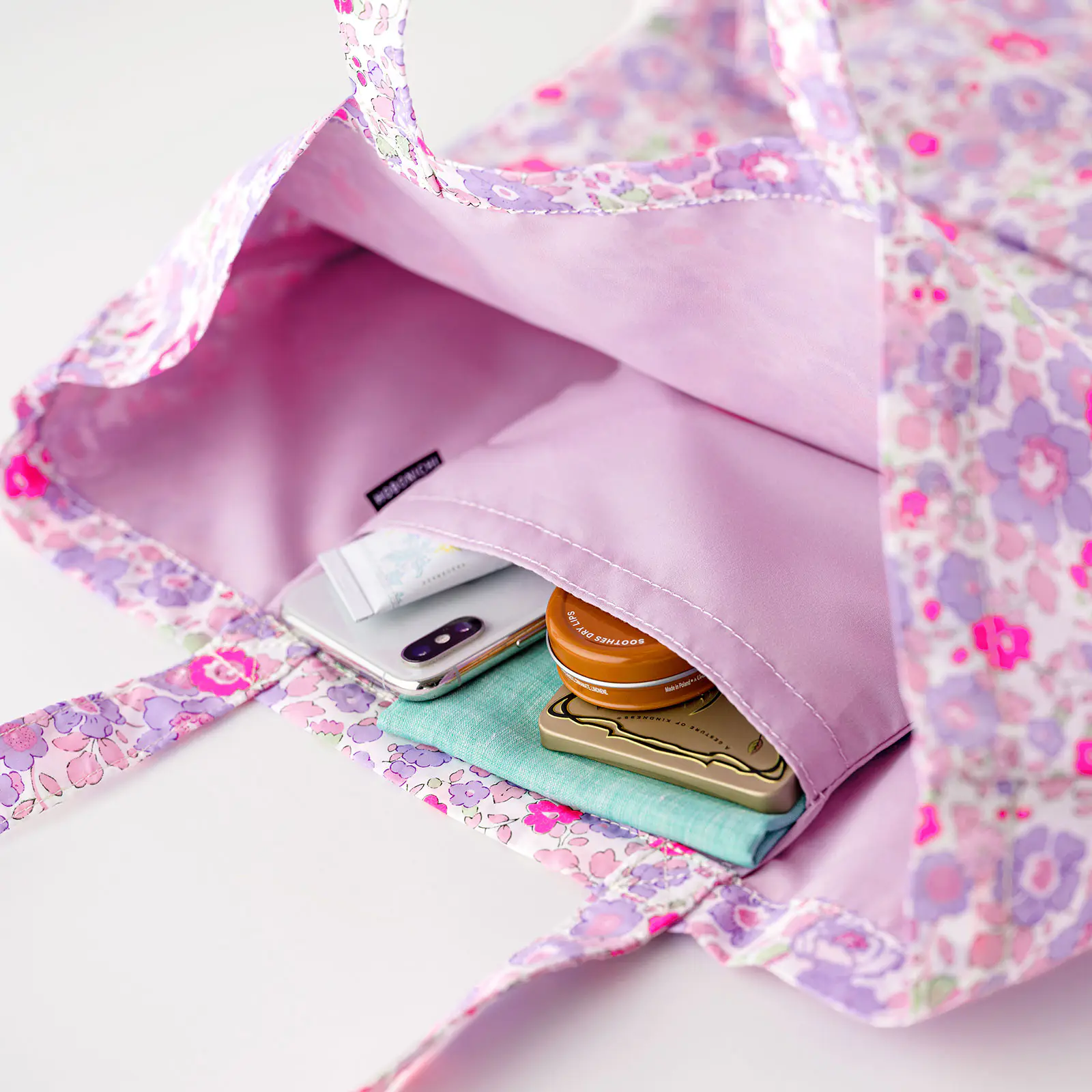 The pocket in the tote bag’s interior is great for storing small items for quick access, such as a smartphone or handkerchief. You can also fold up the bag into a compact shape and tuck it into this pocket for easy portability.