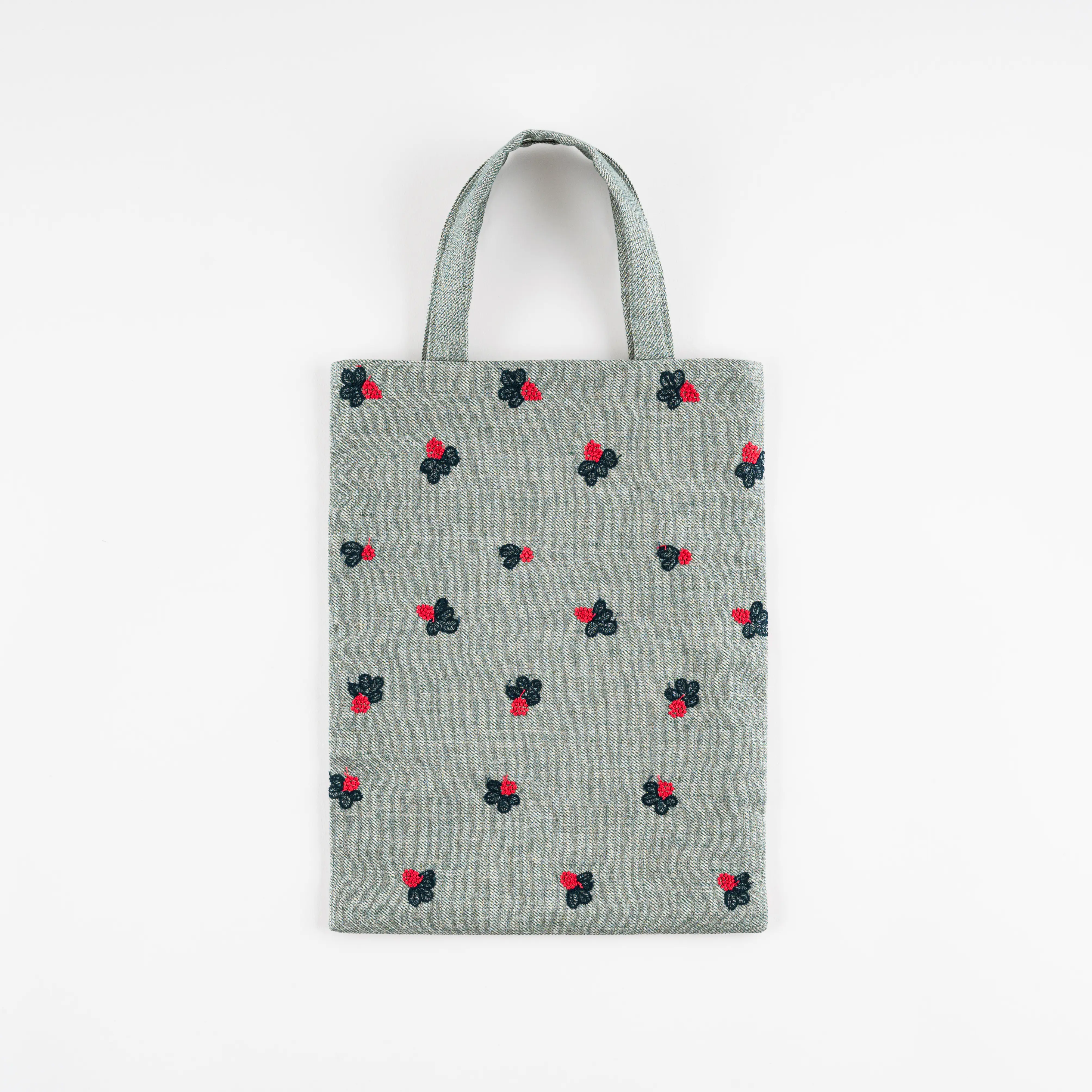 The material comes in green cotton linen with a gentle touch. It is embroidered with pretty berry embroidery in red and navy threads.