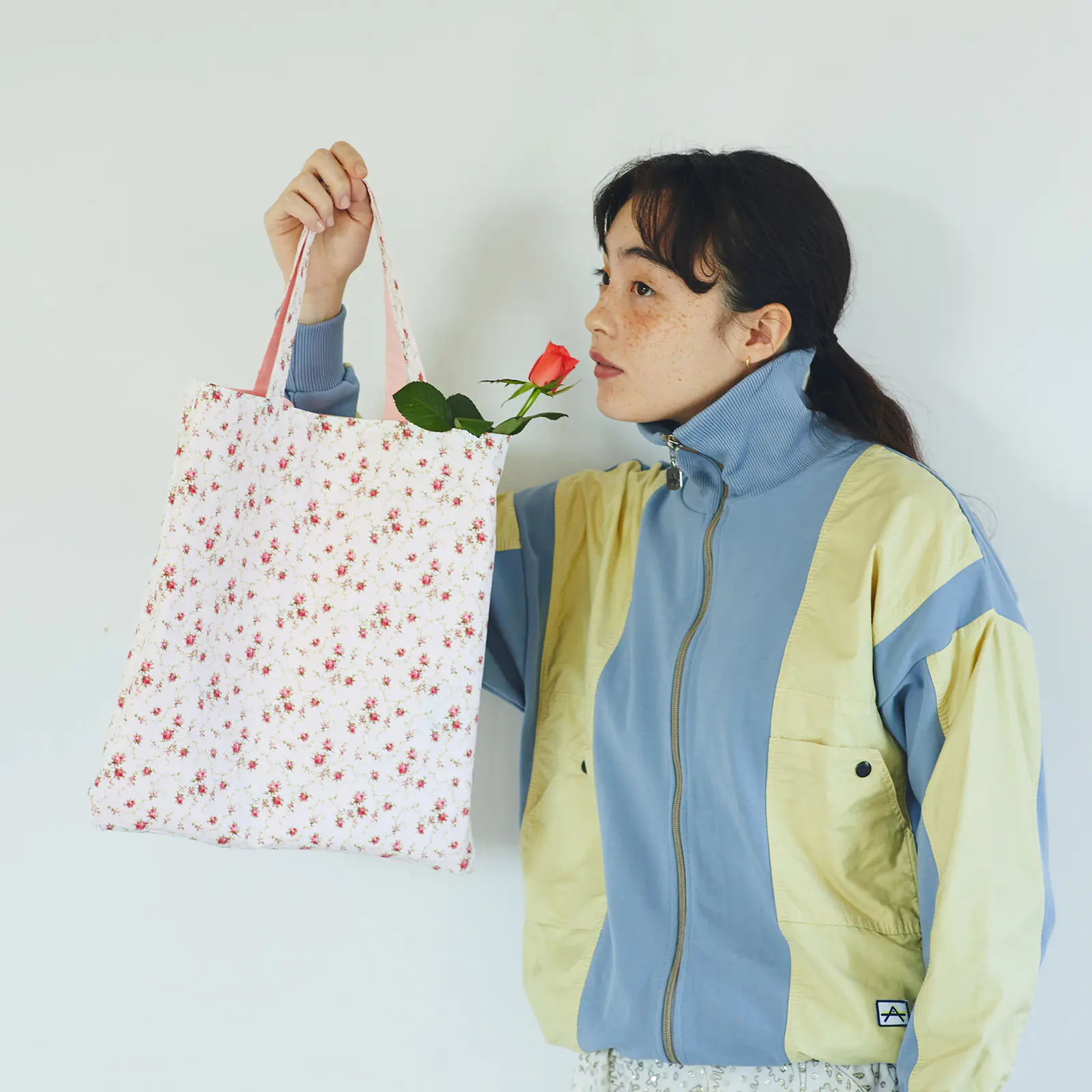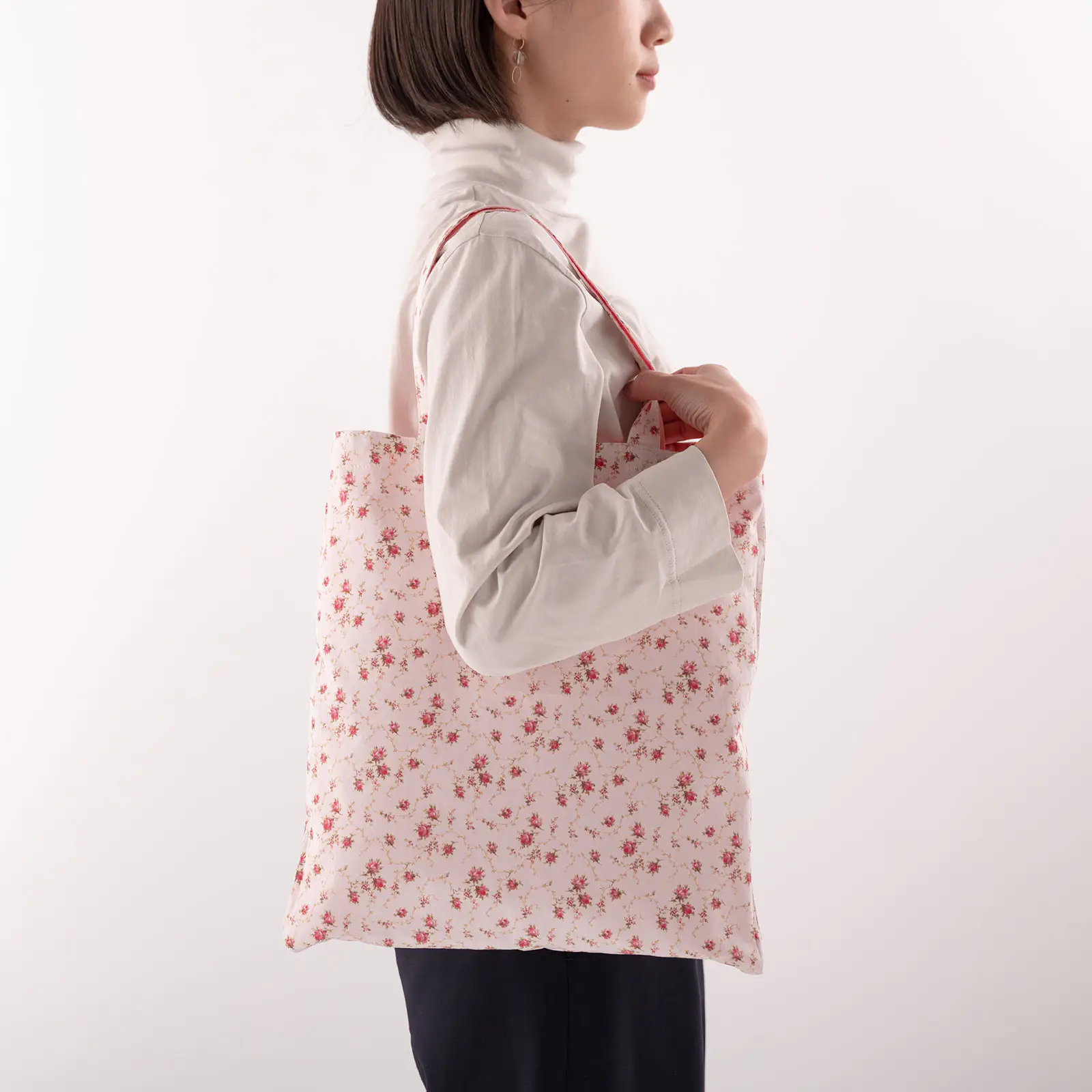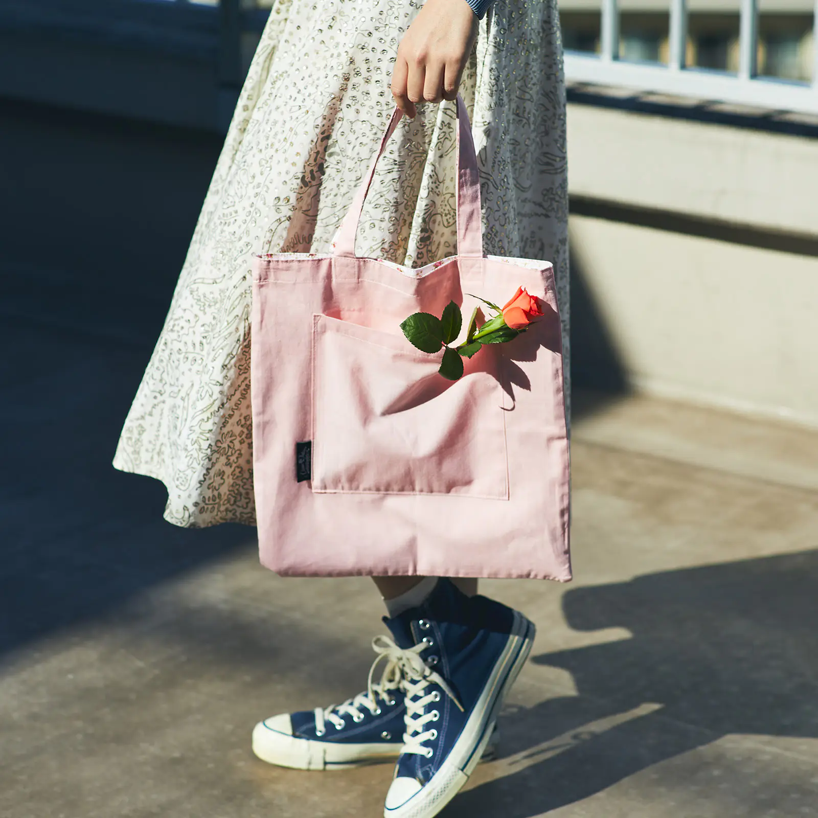 The tote bag is reversible, with the front blooming with roses and the back with a calming pink. The pink side includes a large pocket to sort your bag inside.