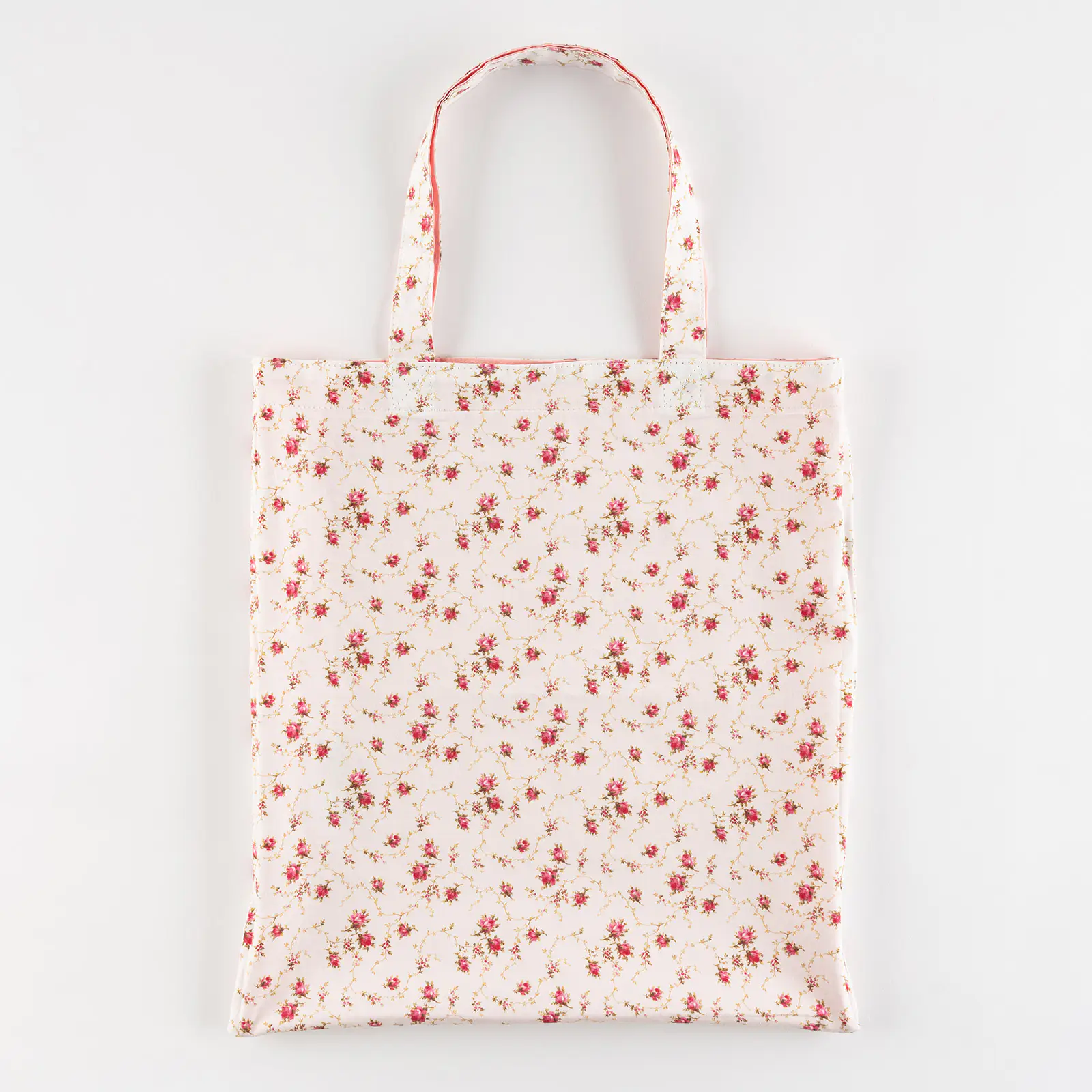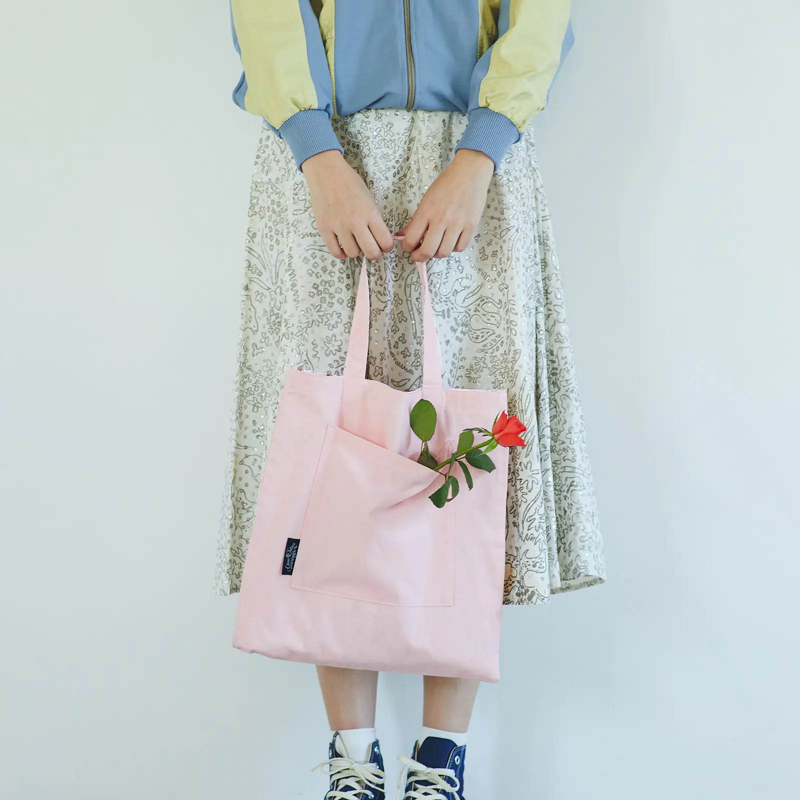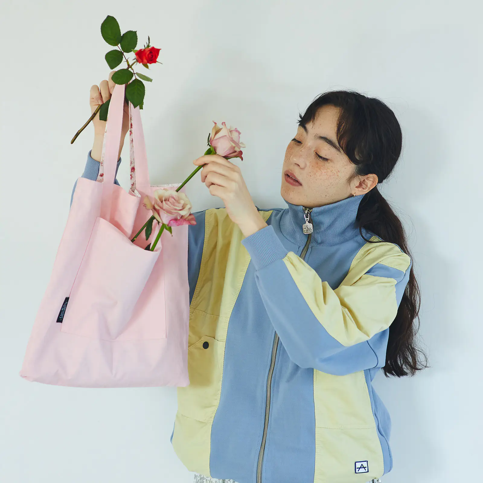 The tote bag is reversible, with the front blooming with roses and the back with a calming pink. The pink side includes a large pocket to sort your bag inside.
