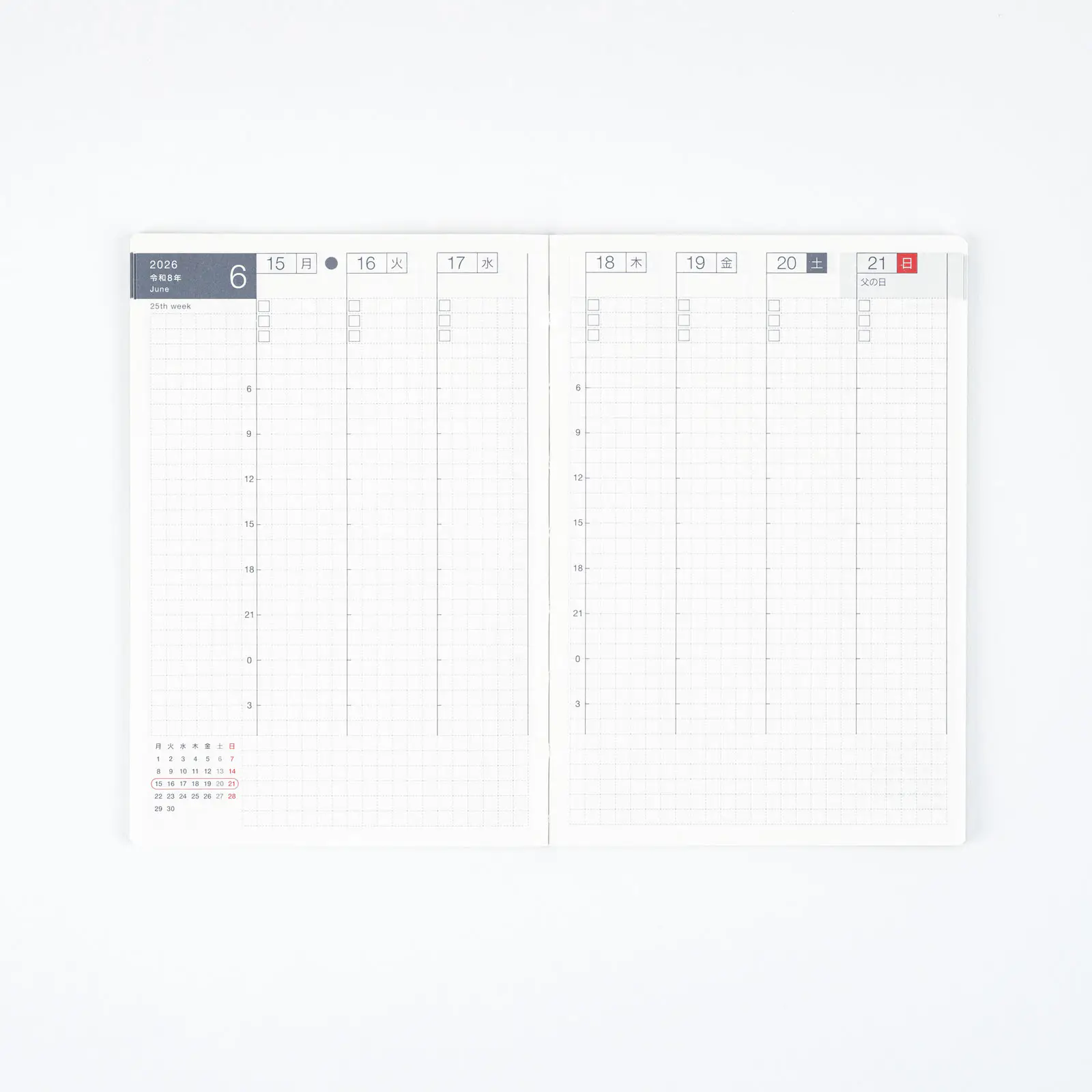 This weekly calendar is a supplement to the A6 Hobonichi Techo Original. Each two-page spread covers an entire week, allowing you to view your schedule at a glance. Each daily column includes a full 24-hour timeline and three checkboxes at the top, making it easy to plan out your week.