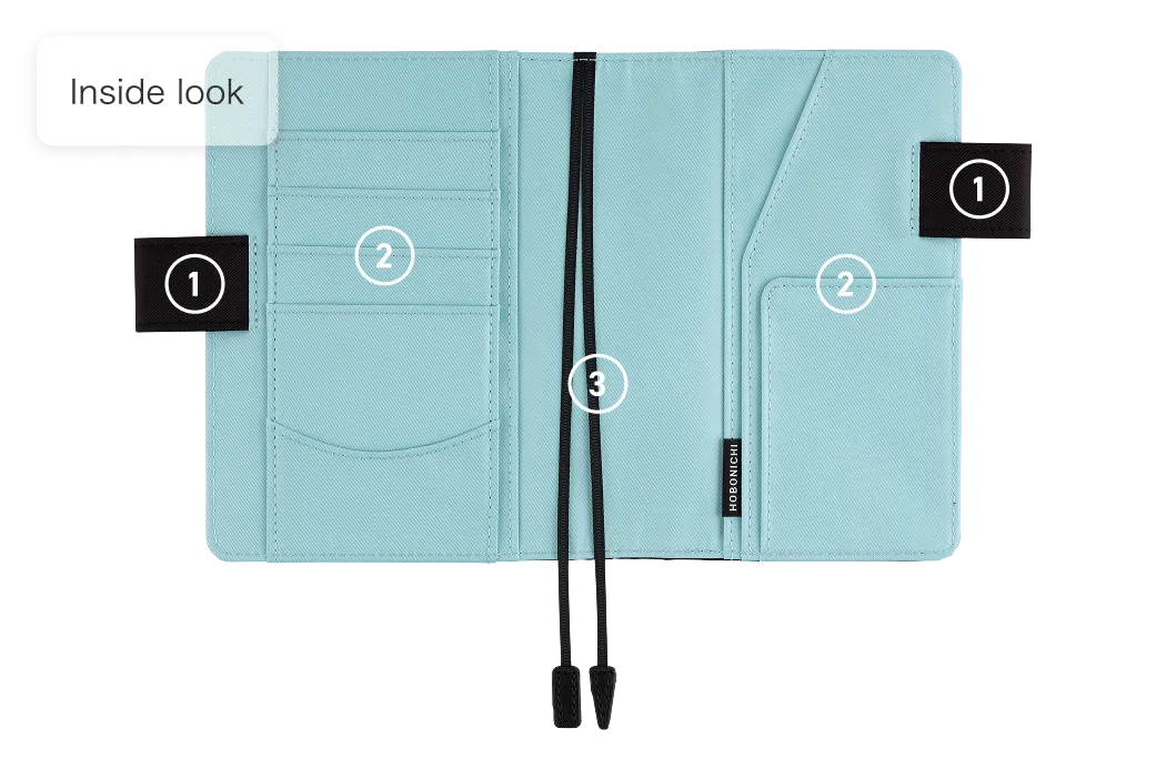 Ever since it first appeared in the 2003 edition lineup, this cover type has been loved by many and is the basic shape of the Hobonichi Techo cover. The main characteristics are the two pen holders that keep the cover shut and the various pockets.