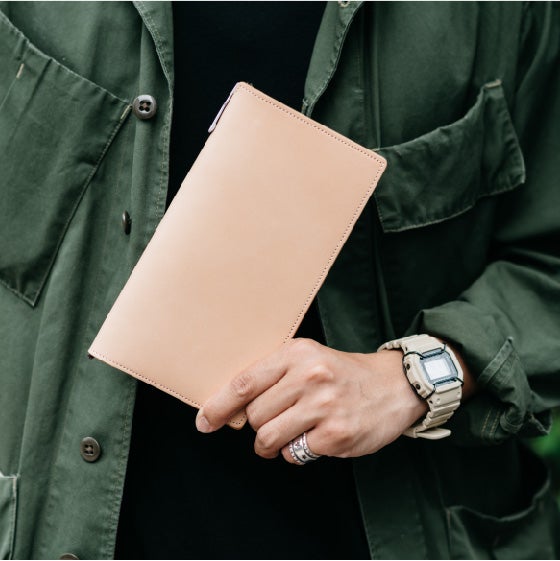 I enjoy experiencing the transformation of leather over time, and I would love if people used these covers long term. This year we used a really high-quality leather called “Tochigi Leather,” and users should look forward to seeing the appearance of the leather change as they use it. It’s pretty easy to imagine how the Camel and the Black colorways change, but the Natural leather cover can really take you by surprise. If you keep the cover clean, it will turn the most gorgeous shade of amber.