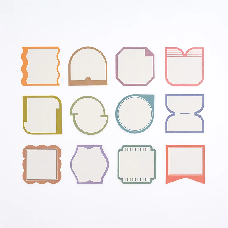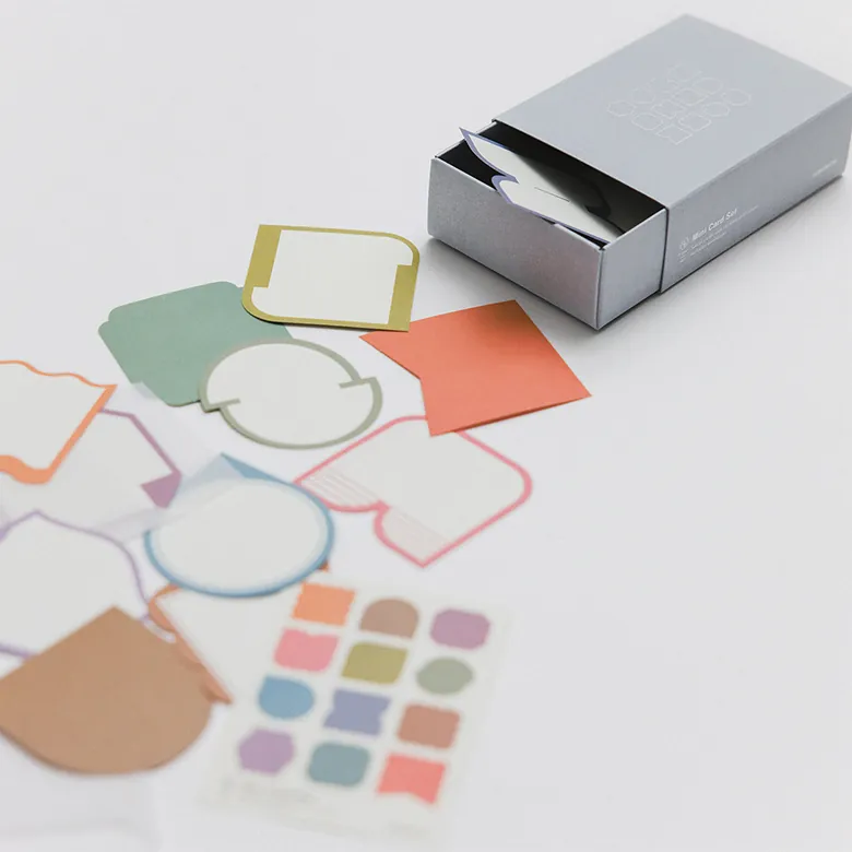 This set includes 12 unique card shapes, with two of each design. It also comes with a sheet of matching sealing stickers and six translucent envelopes, all packaged in a sleeve-style box.