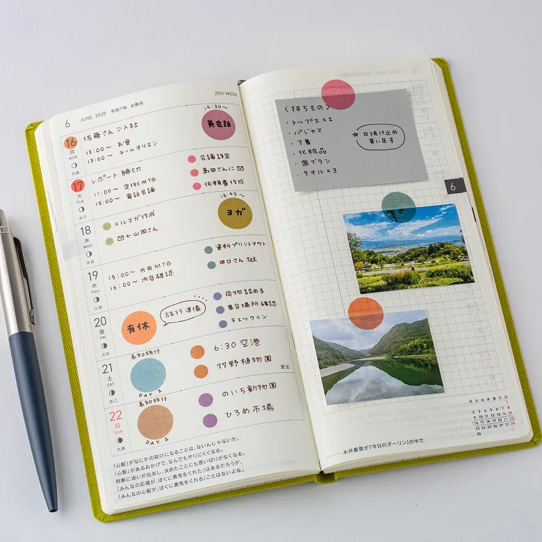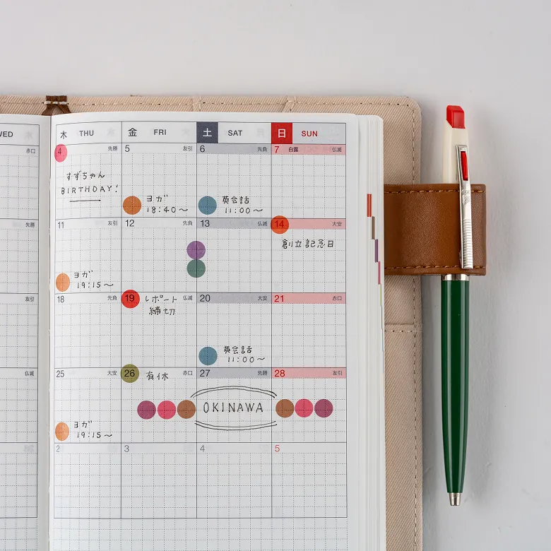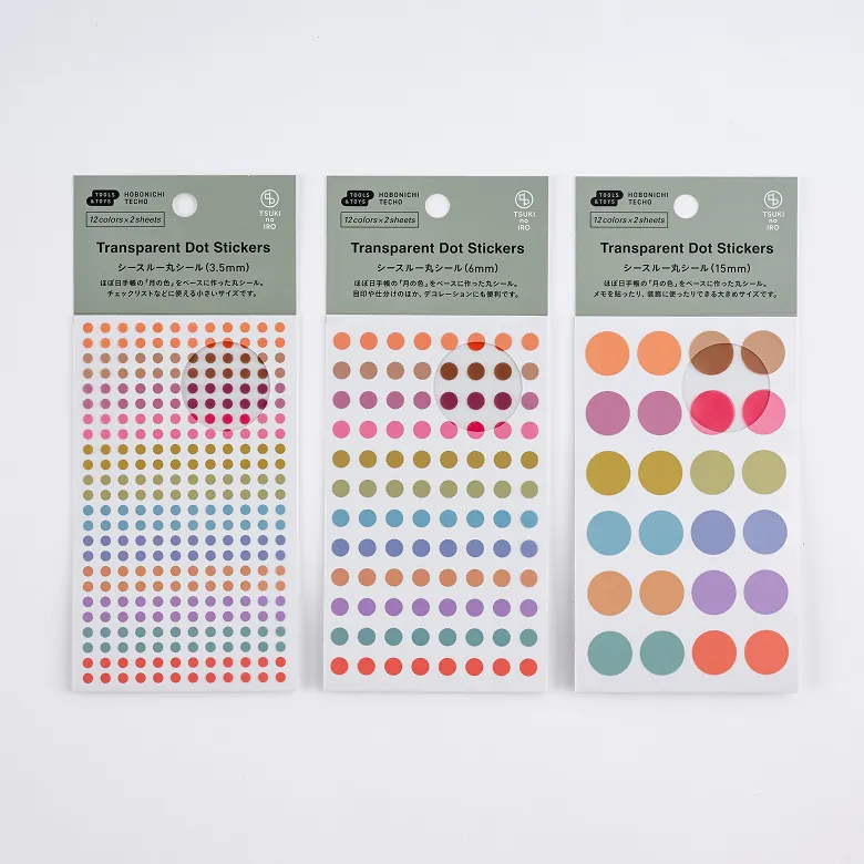 The Transparent Dot Stickers are made of sturdy, transparent PET material and come in round shapes that fit neatly within the grid of the Hobonichi Techo. Available in three different sizes.