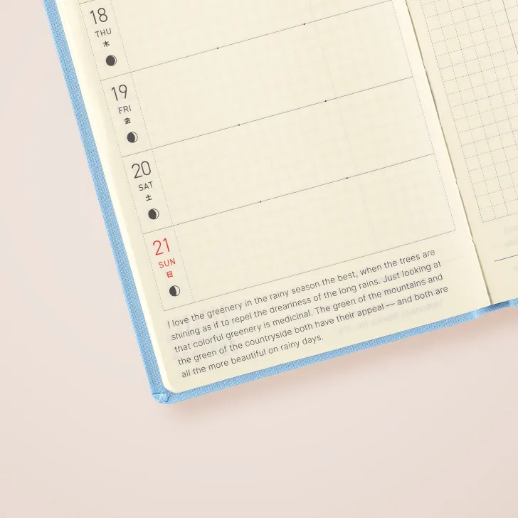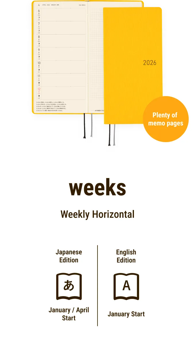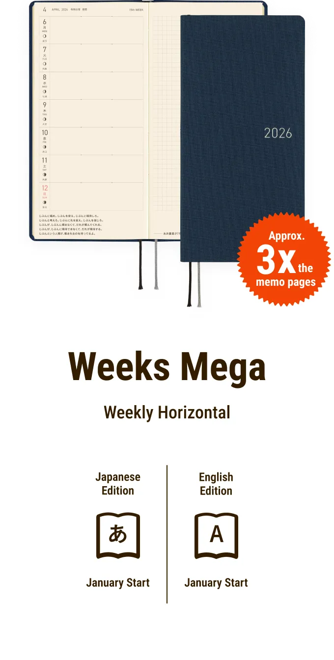 The Hobonichi Techo Weeks is a slim, easy-to-carry planner with a weekly horizontal schedule layout. The main pages follow a “Weekly Schedule + Memo” format, making it simple to keep track of your plans while providing more writing space than meets the eye.