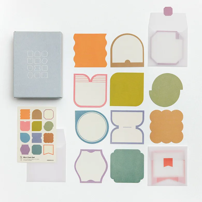 This set includes 12 unique card shapes, with two of each design. It also comes with a sheet of matching sealing stickers and six translucent envelopes, all packaged in a sleeve-style box.